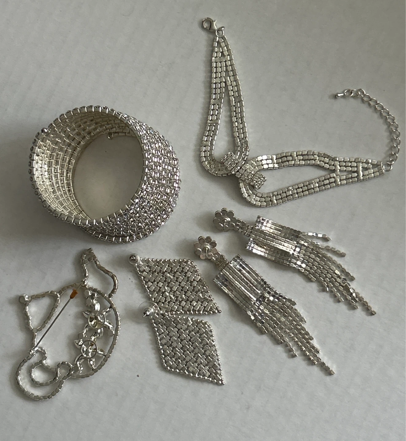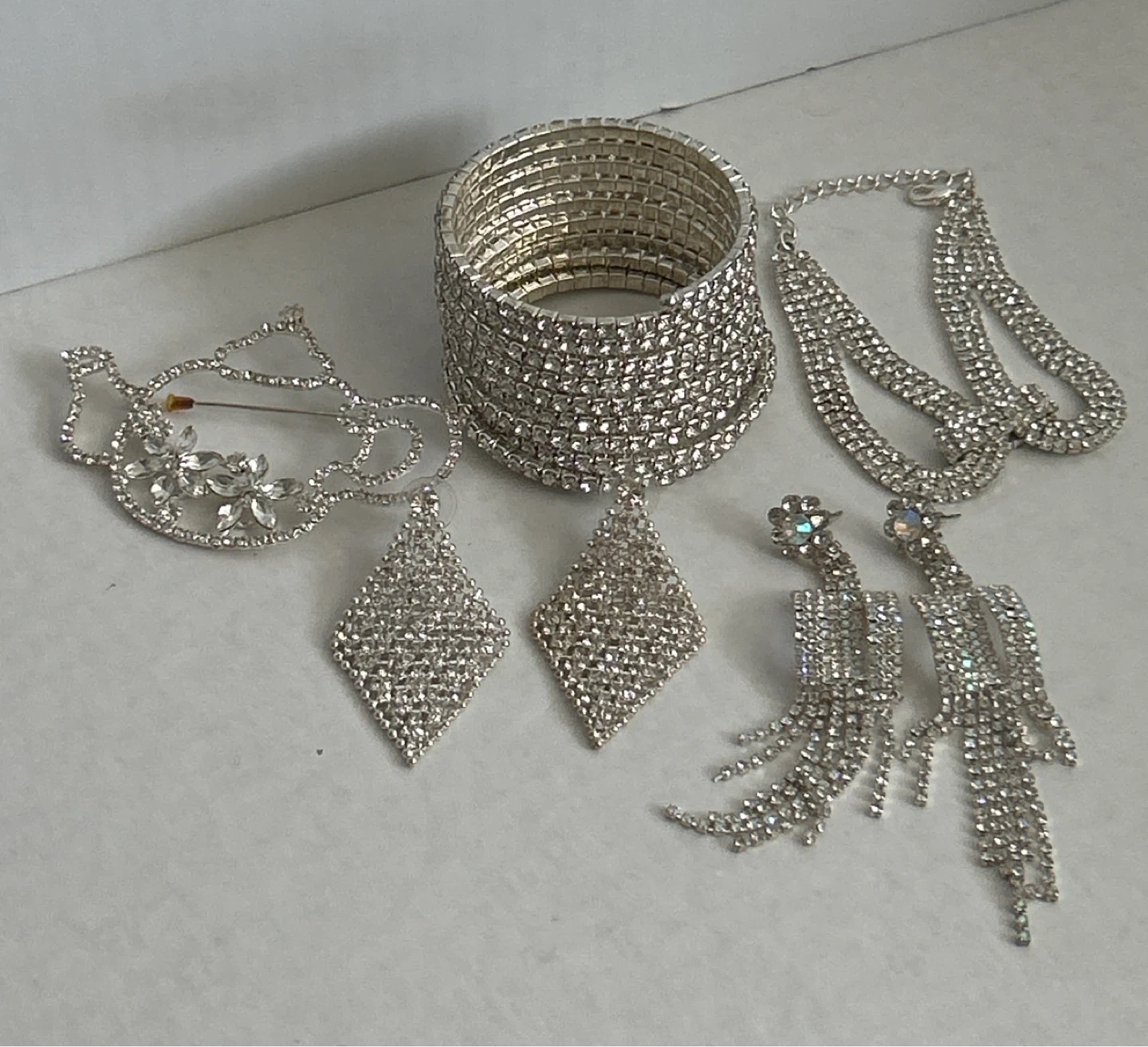 Selling a collection of good quality sparkly rhinestone jewelry set featuring 2 pieces of bracelets, one beautiful knot style and a wide cuff bracelet, 2 pairs of dangling earrings, and a brooch. The 5 pieces are adorned with clear rhinestones for a dazzling effect. Perfect for adding glamour to special occasions!