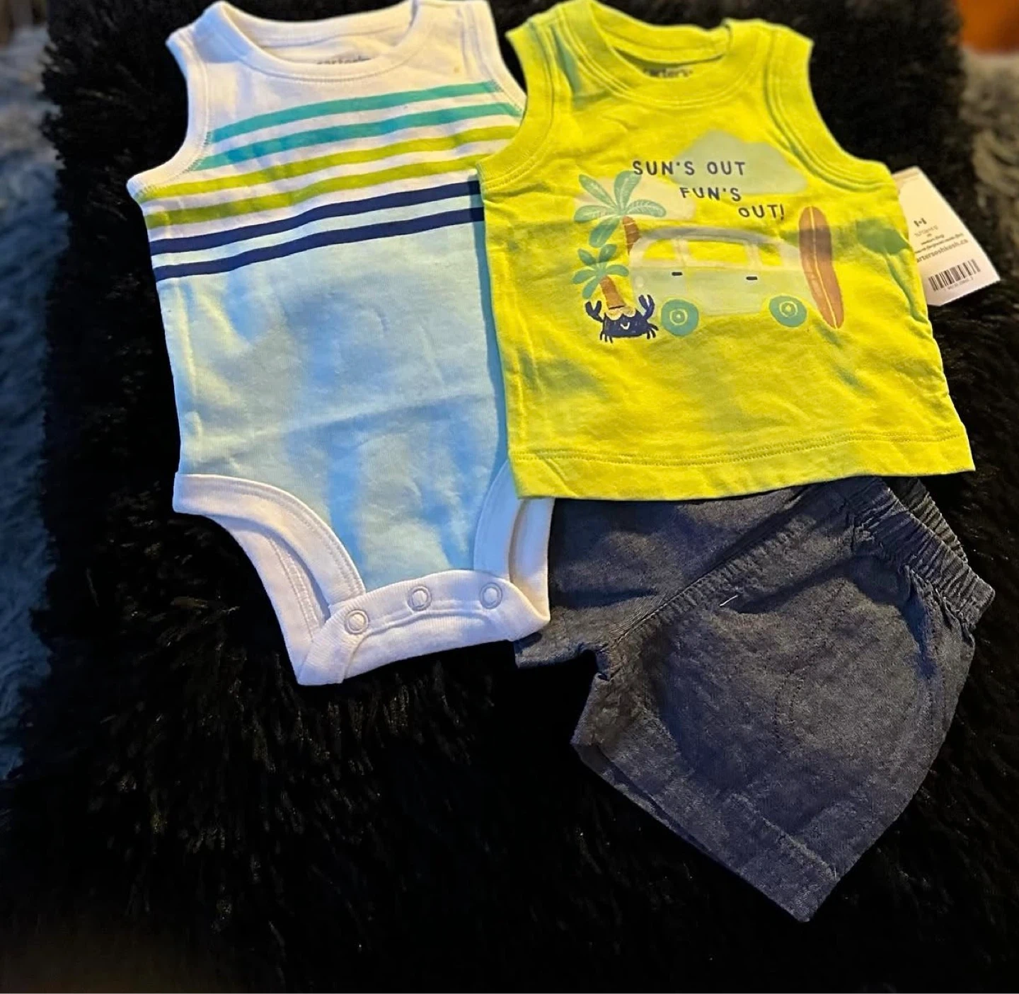 This adorable set includes a striped bodysuit and a graphic tank top with shorts. Both pieces are sleeveless and made from soft cotton. It's perfect for warm weather fun!