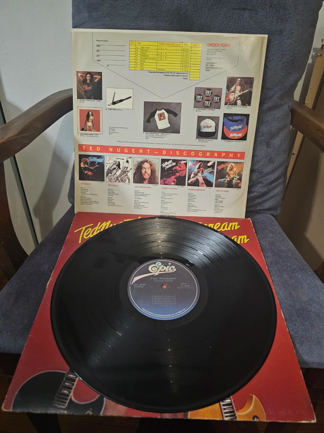 Ted Nugent's 1980 album Scream Dream on vinyl. Features the tracks Wango Tango and Scream Dream. This Epic Records release is a classic for rock fans.