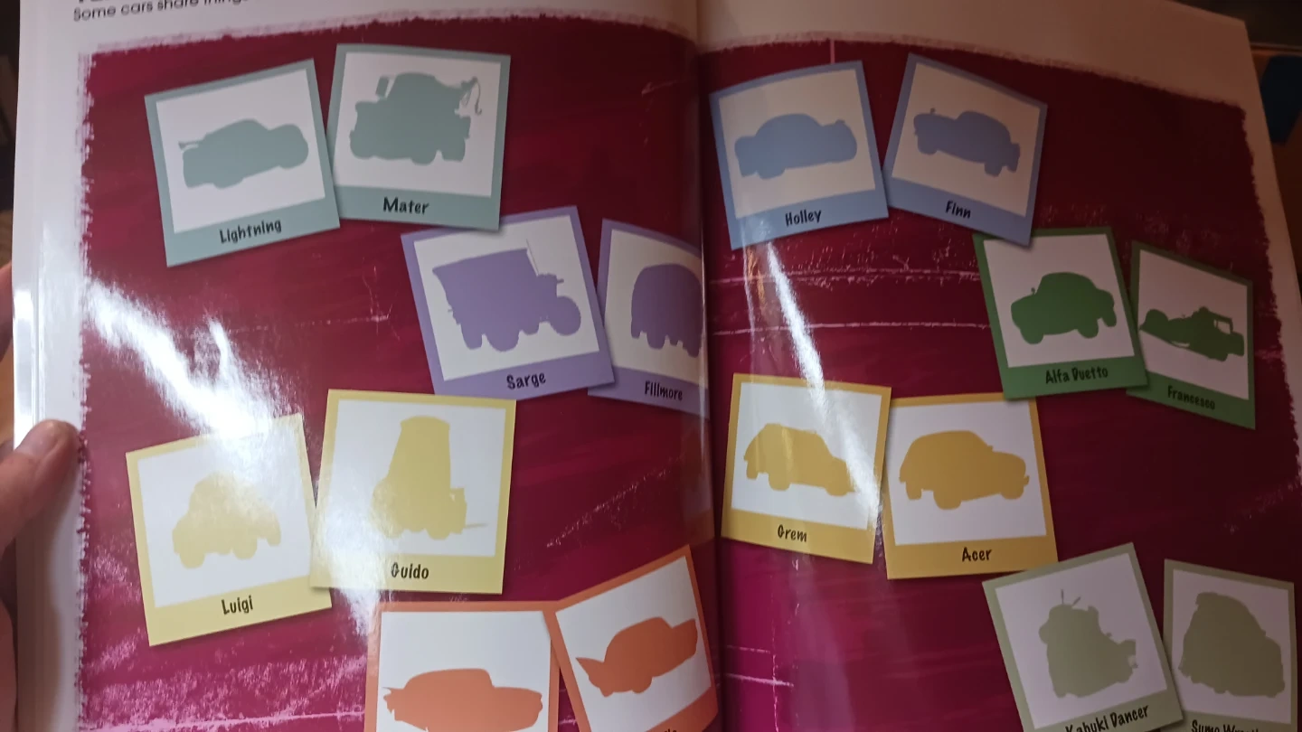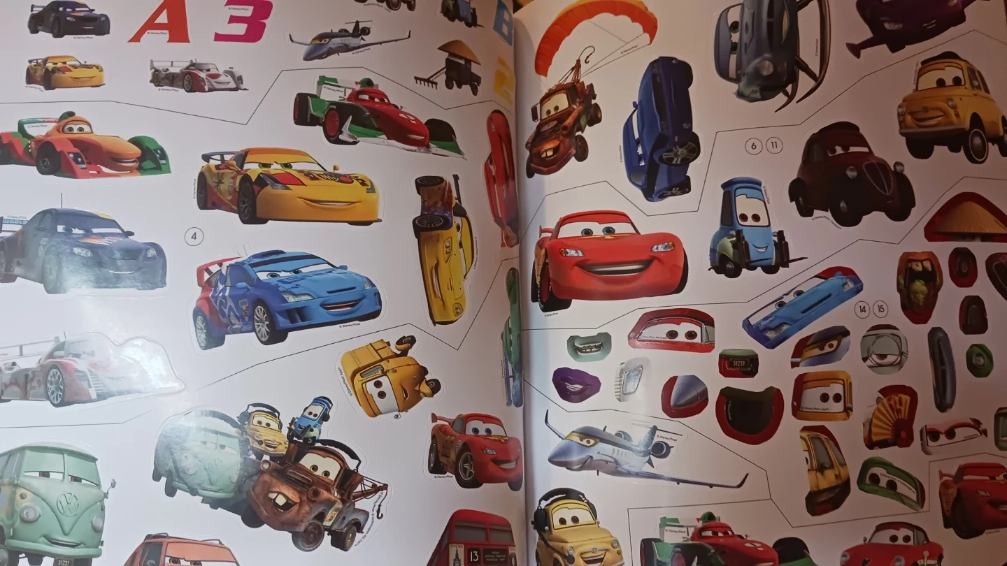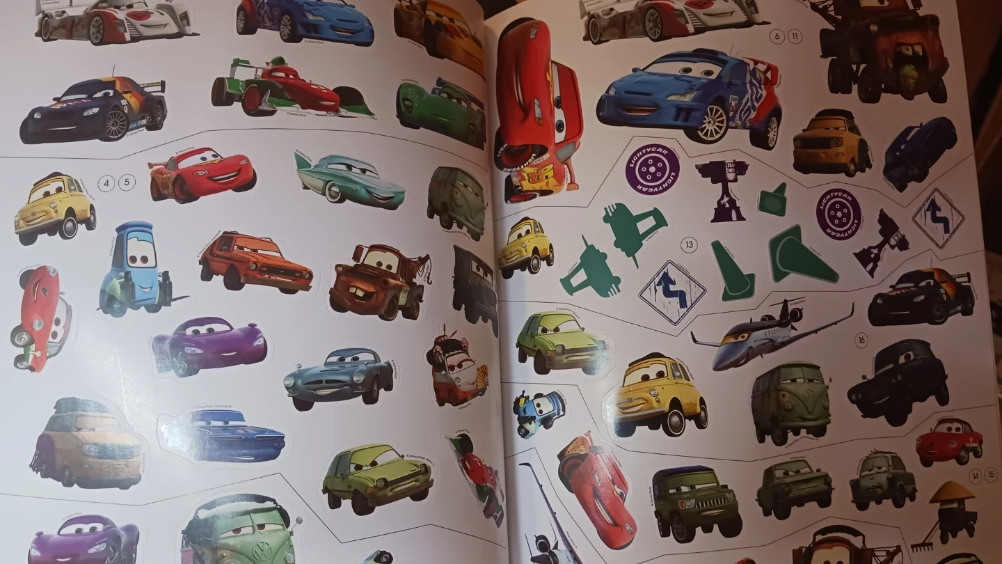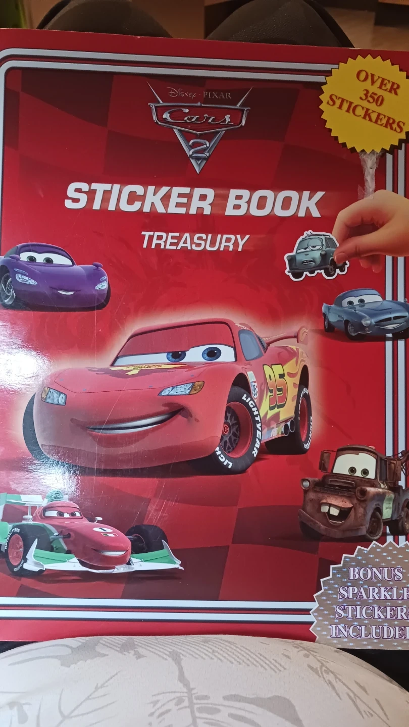 Disney Pixar Cars 2 Sticker Book Treasury. Over 350 stickers included! Features characters like Lightning McQueen and Mater. Bonus sparkle stickers are also included. The final picture shows the price on Amazon!
