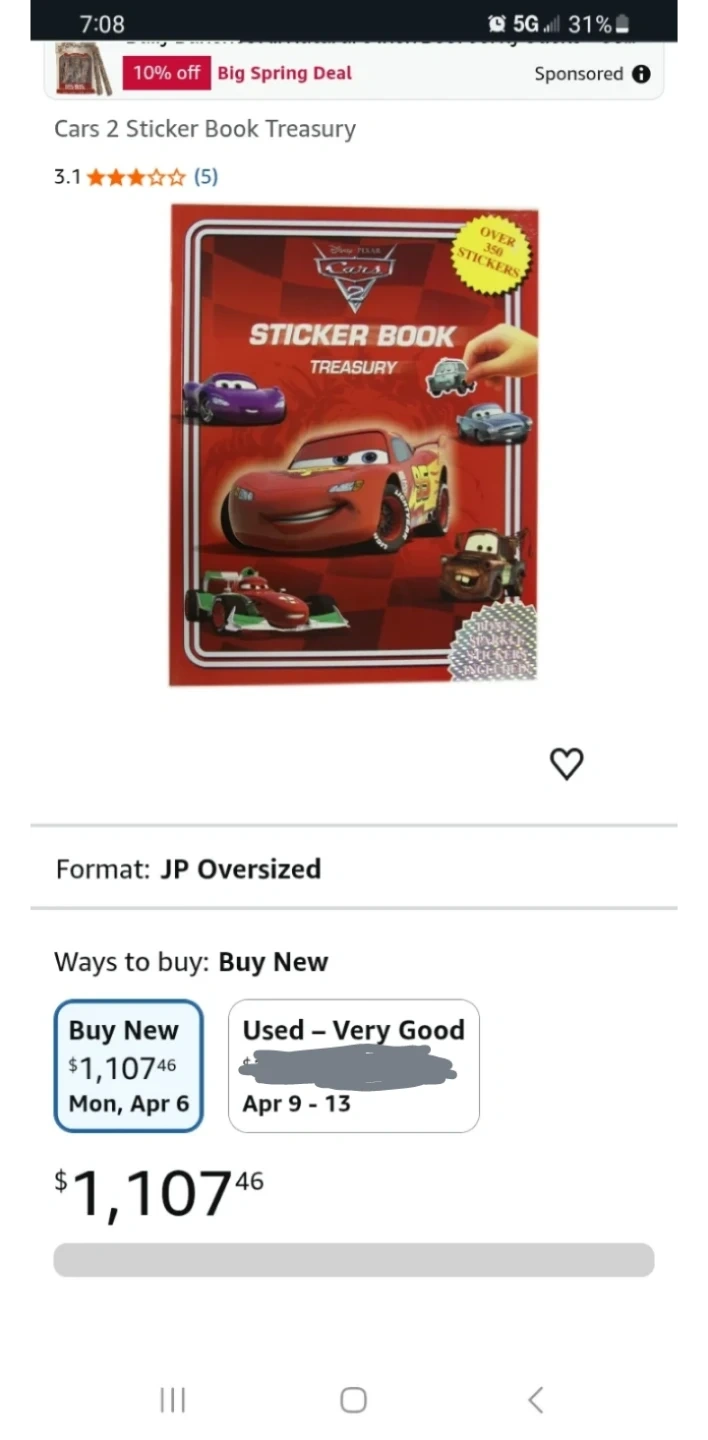 Disney Pixar Cars 2 Sticker Book Treasury. Over 350 stickers included! Features characters like Lightning McQueen and Mater. Bonus sparkle stickers are also included. The final picture shows the price on Amazon!