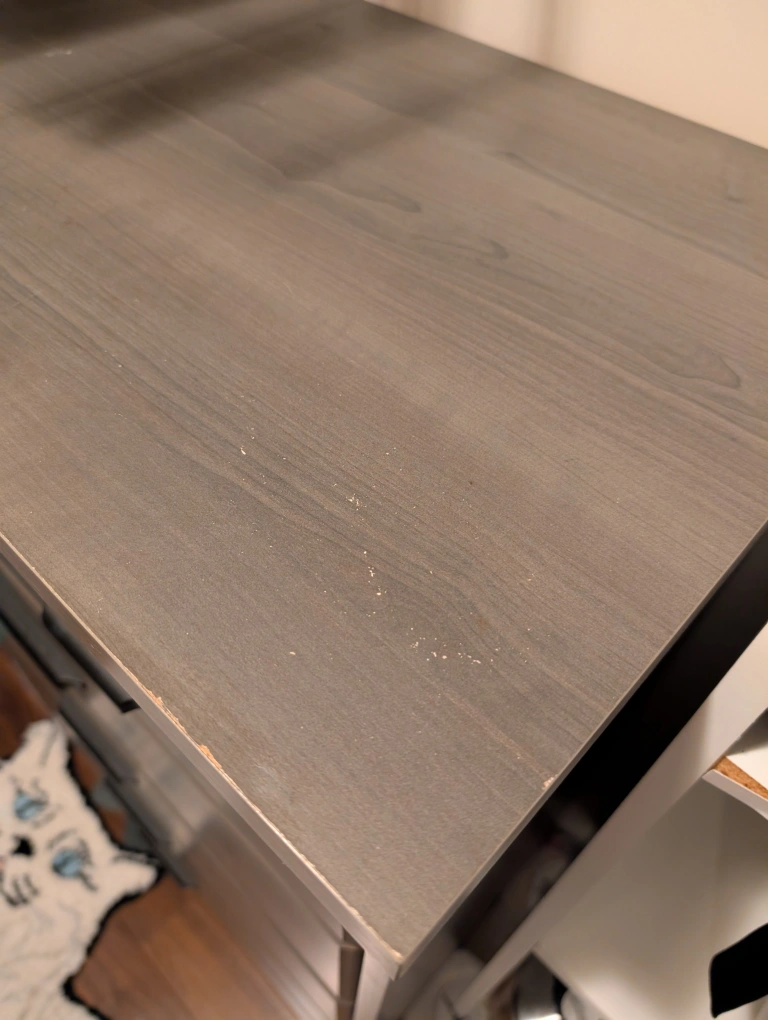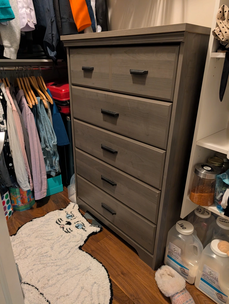 Dresser with a woodgrain finish. Includes multiple drawers. Features black handles. A great addition to your bedroom to store all of your essentials.