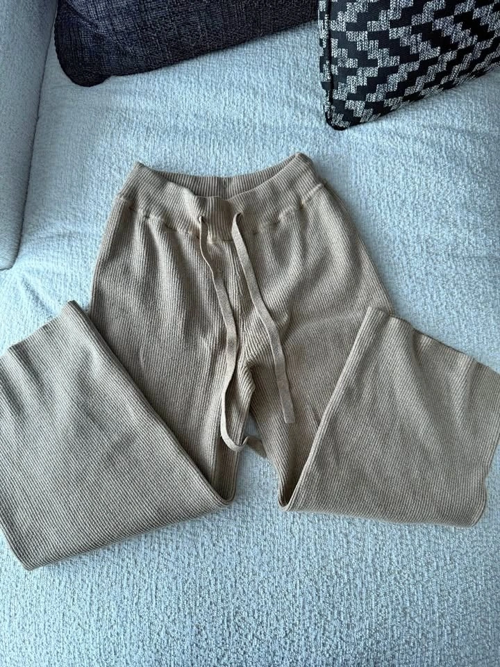 Soft ribbed knit pants in a warm neutral beige/taupe tone. Designed with a relaxed wide-leg silhouette and an elastic waistband with adjustable drawstring.