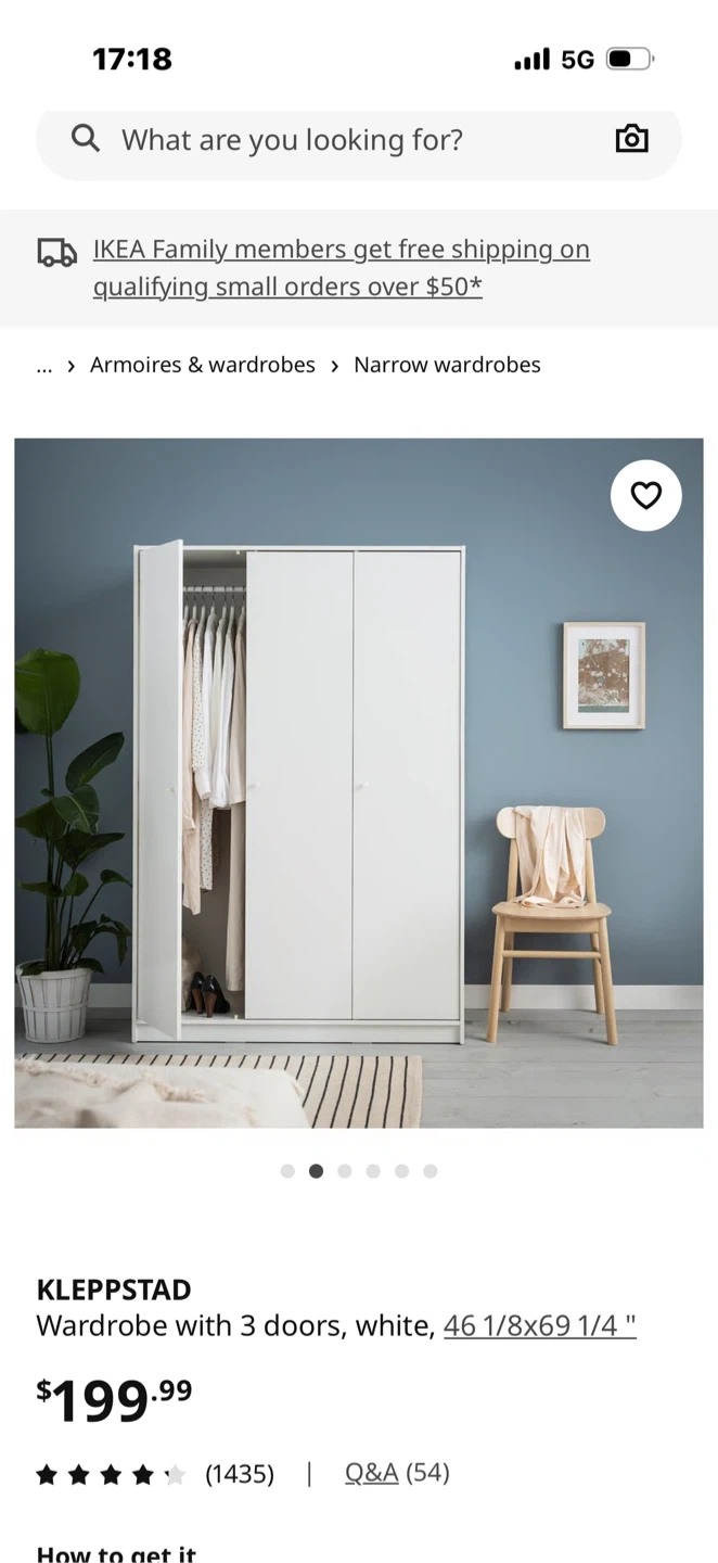 Looking to sell this IKEA Kleppstad wardrobe in white. It comes with three doors and offers ample storage space. Dimensions are 46 1/8x69 1/4 ". Retails for $199.99
