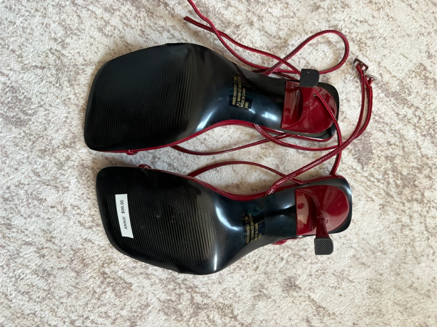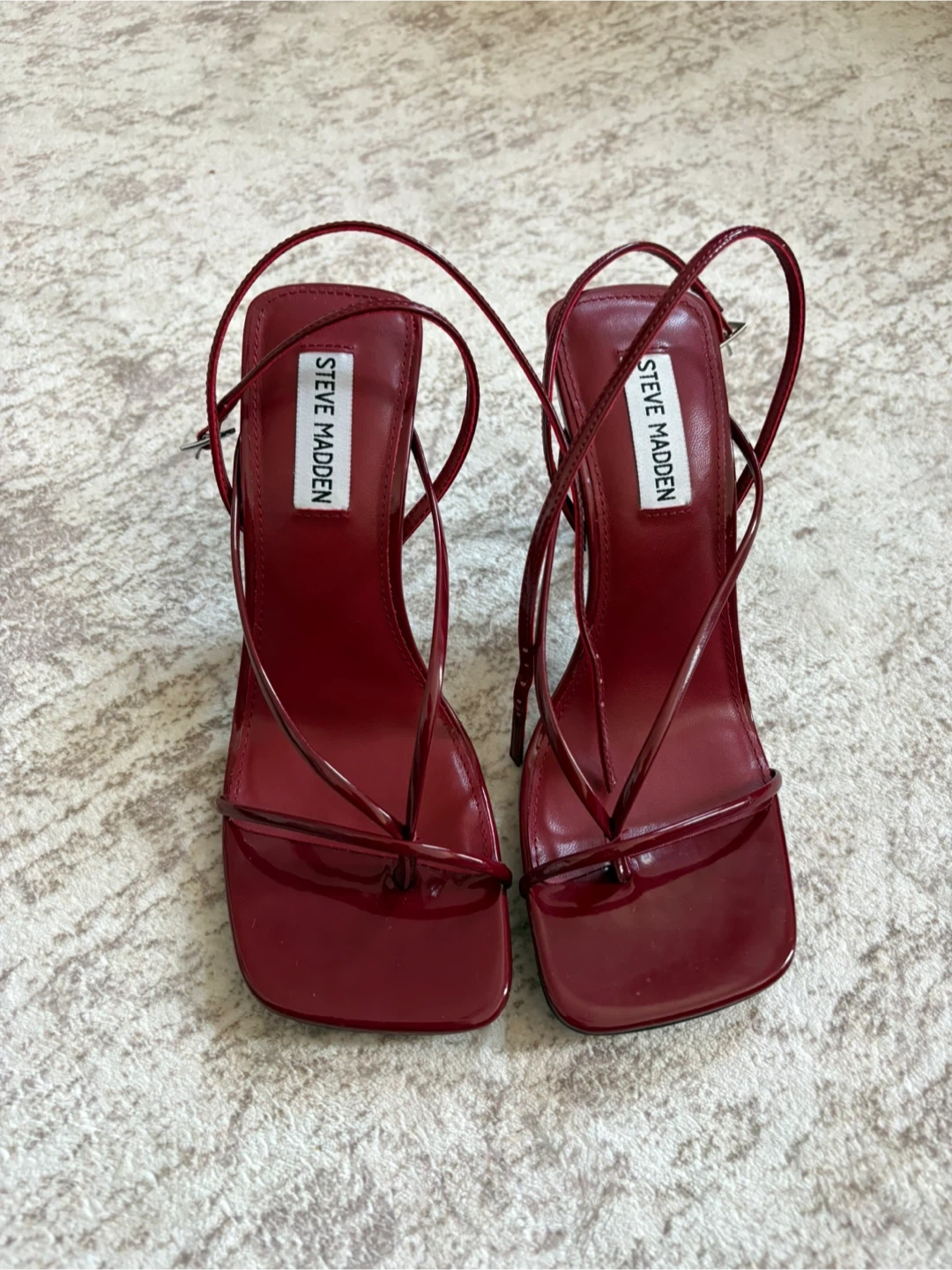 Steve Madden strappy heels in a bold red color. These feature a chic square toe and thin ankle straps. Genuine leather and man-made materials. Original price was $99.95.