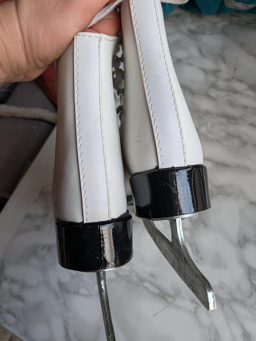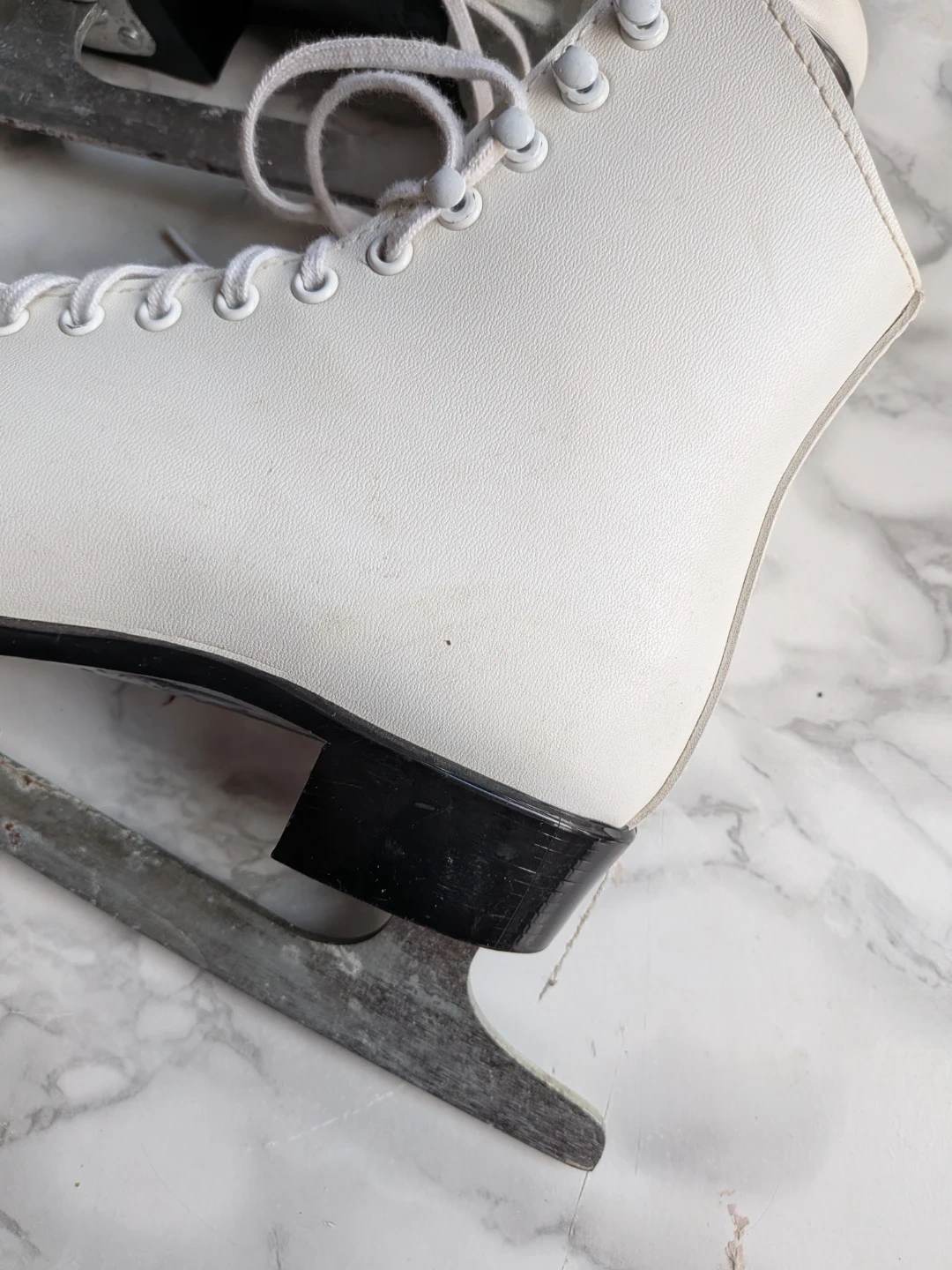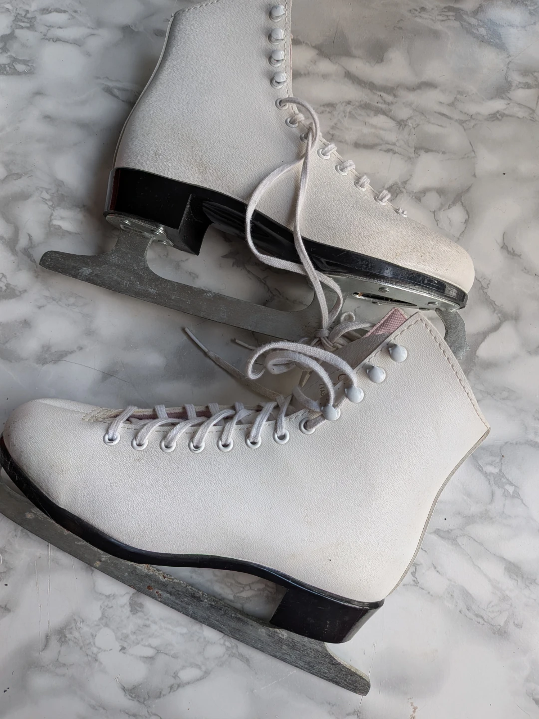 Selling a pair of white figure skates. They have some wear and tear, especially some rust on the blades. Still lots of life left in them though!