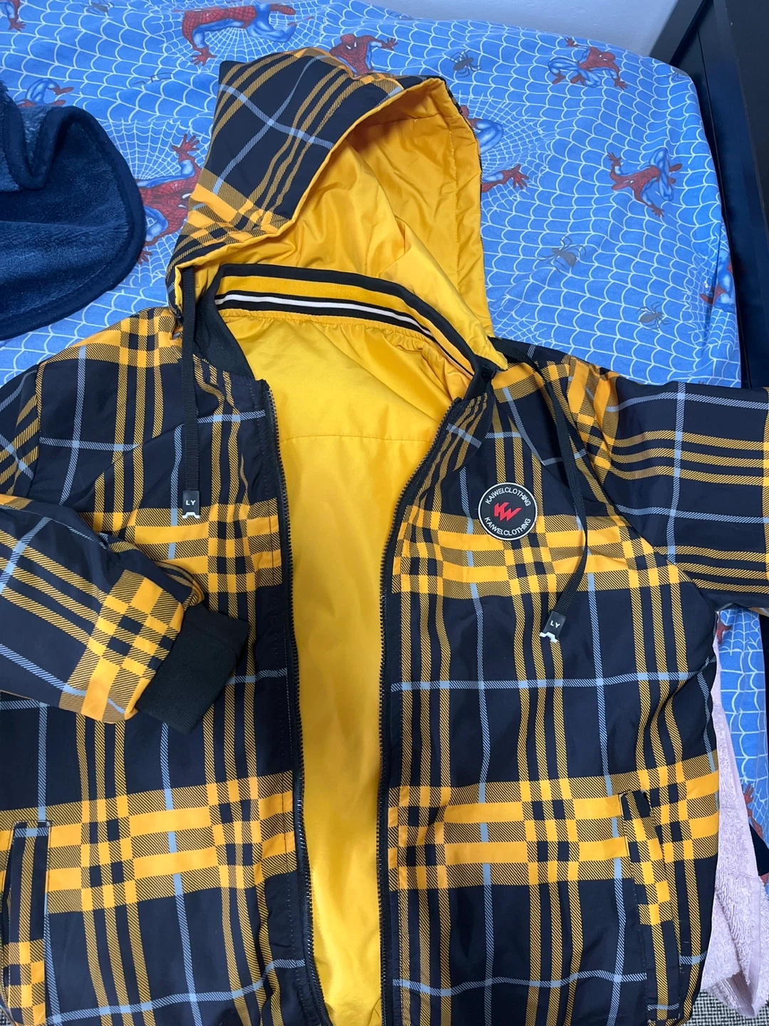 This Kawel Clothing jacket has a bold yellow and black plaid pattern with a reversible bright yellow interior. It's a stylish hooded jacket, perfect for cooler weather! It features a full zip closure and elasticated cuffs and hem.