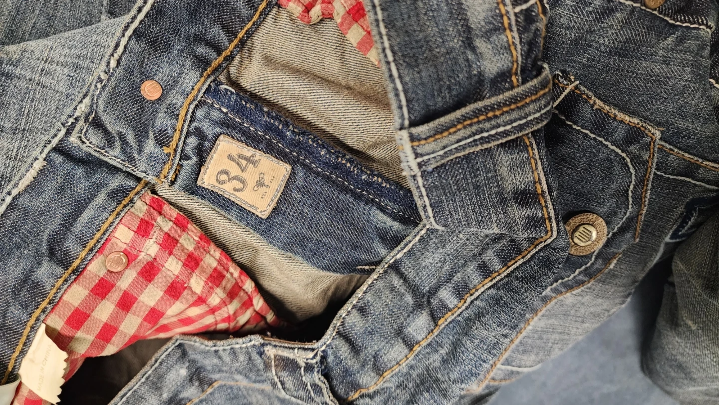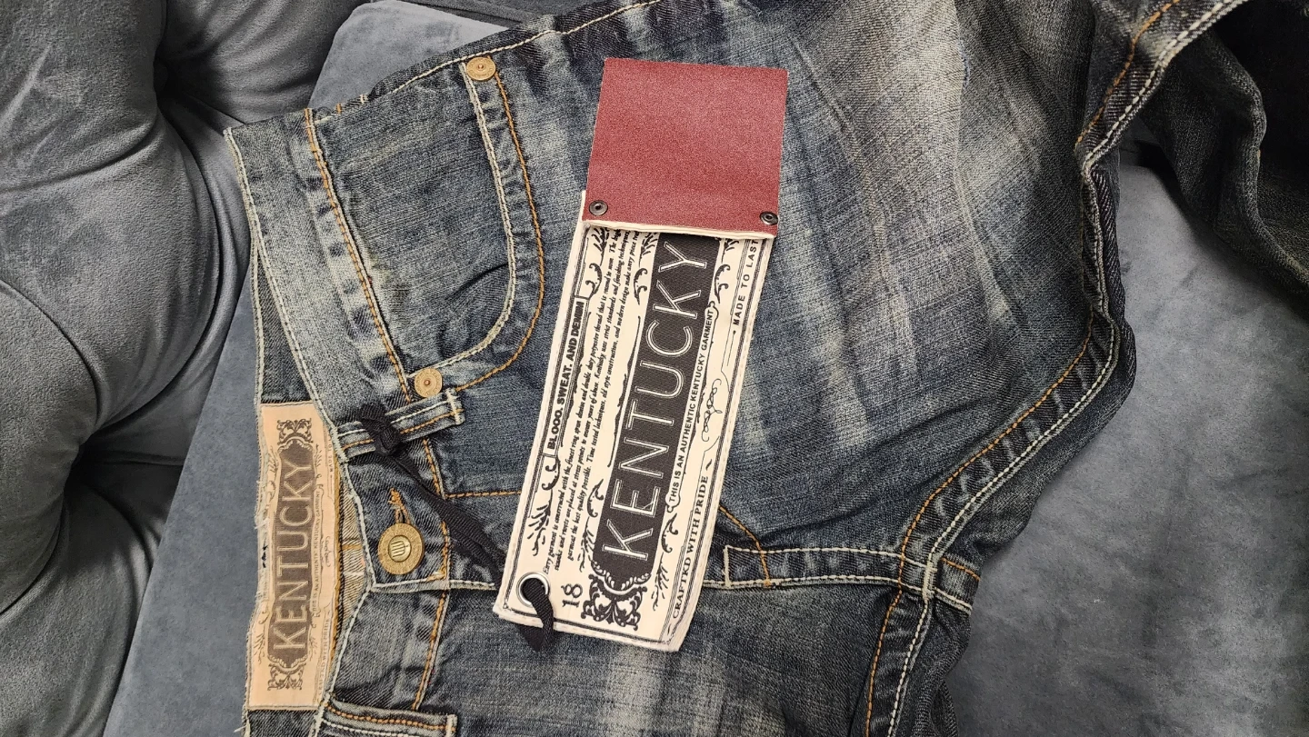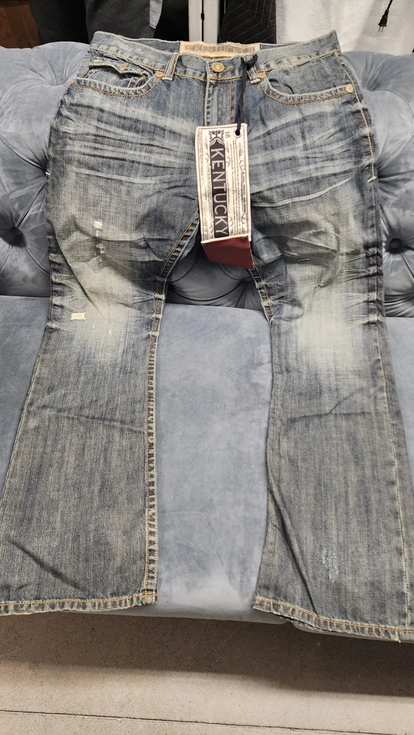 These are Kentucky brand denim jeans. They're a size 34 with a classic blue wash. These jeans have a comfortable, flared leg style.