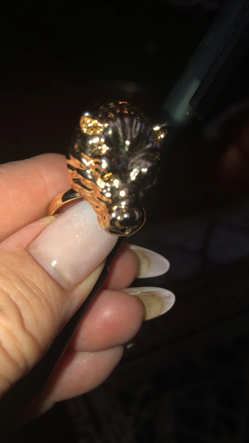 This matching set includes a gold-tone bracelet and a ring, both featuring detailed lion head designs. The bracelet has a mesh-style band and a secure clasp. It's a bold accessory set.