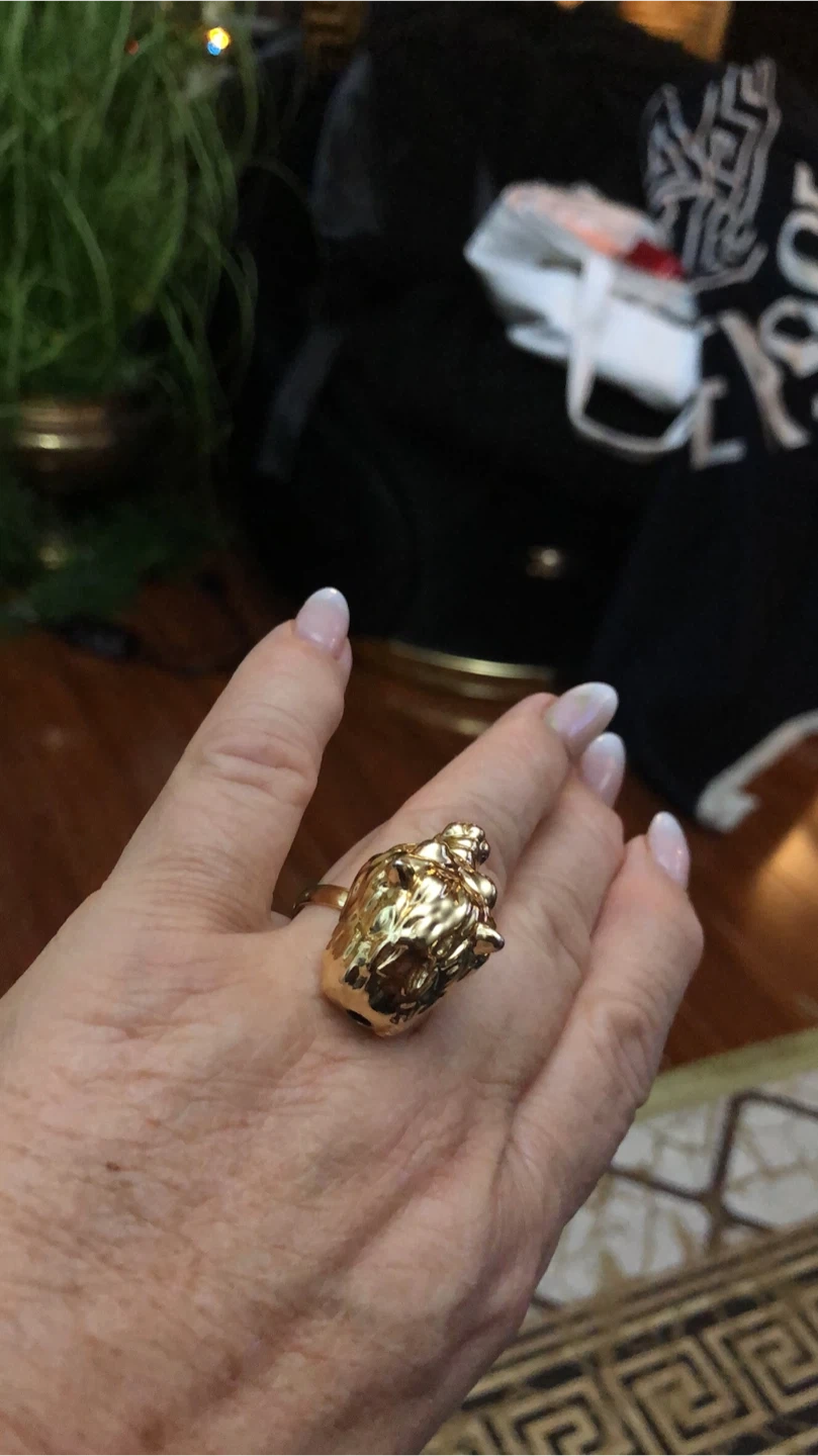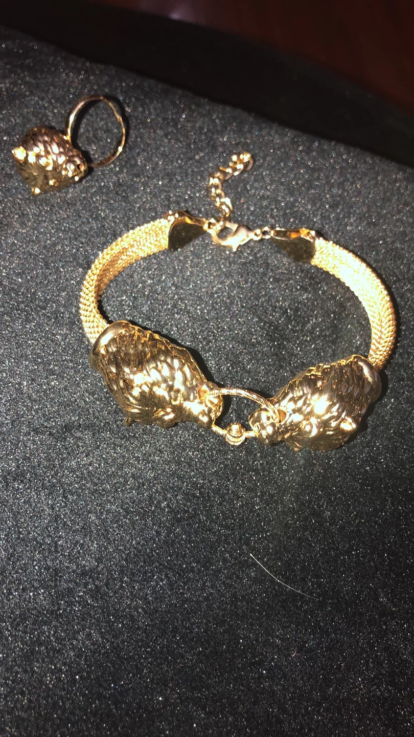 This matching set includes a gold-tone bracelet and a ring, both featuring detailed lion head designs. The bracelet has a mesh-style band and a secure clasp. It's a bold accessory set.