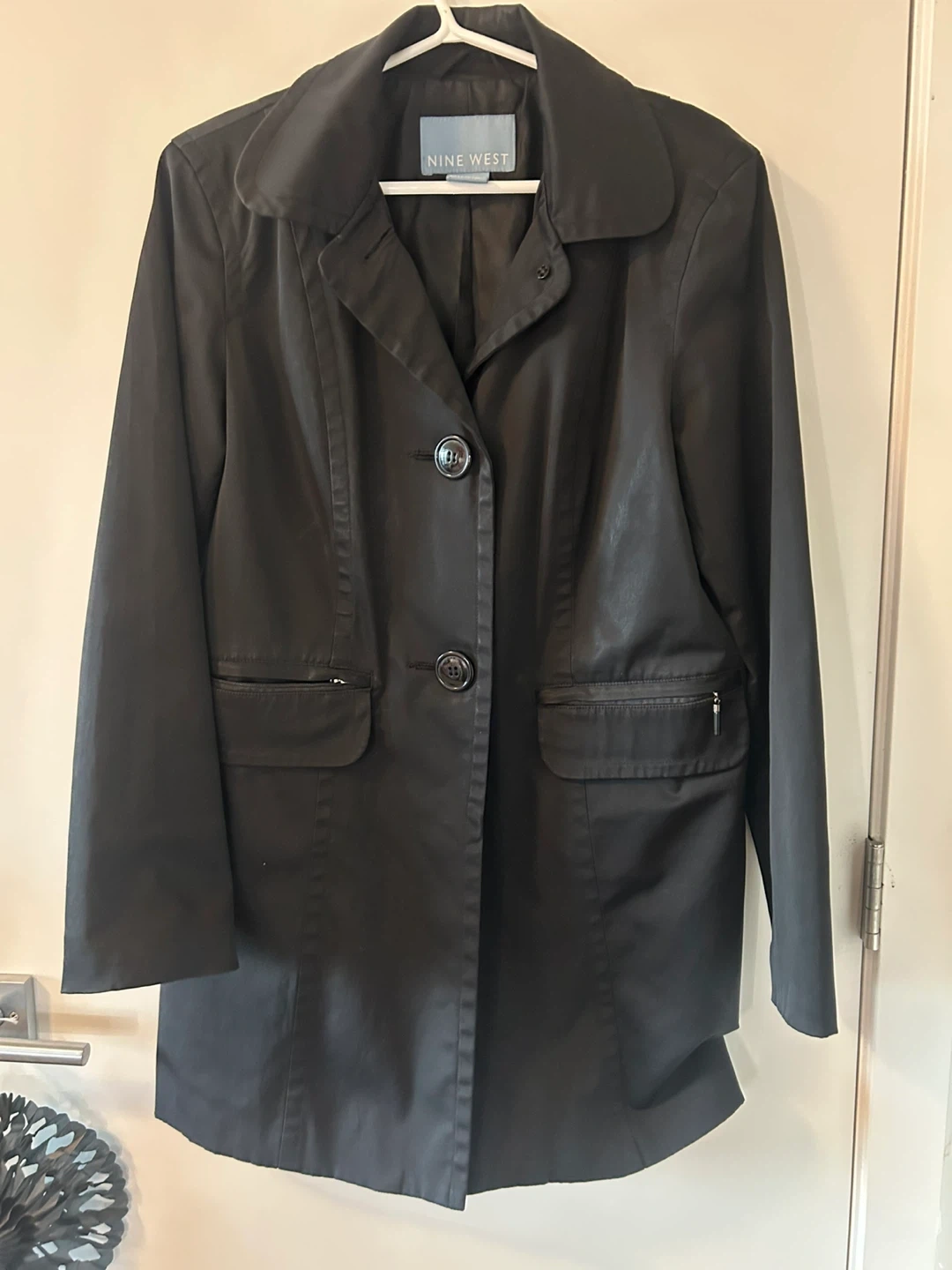 Selling a stylish black rain coat from Nine West! It's in great condition and perfect for those rainy days. A classic and versatile piece to add to your wardrobe
