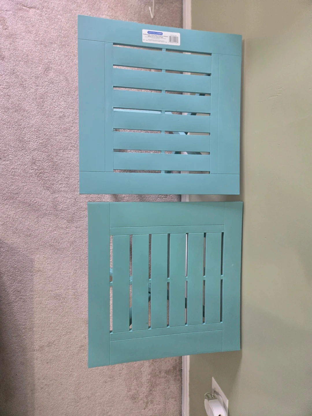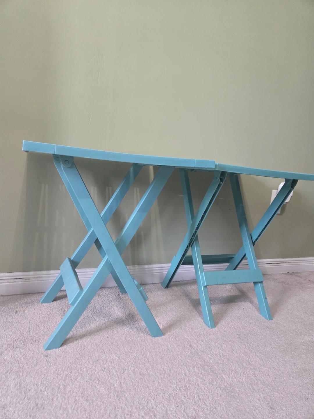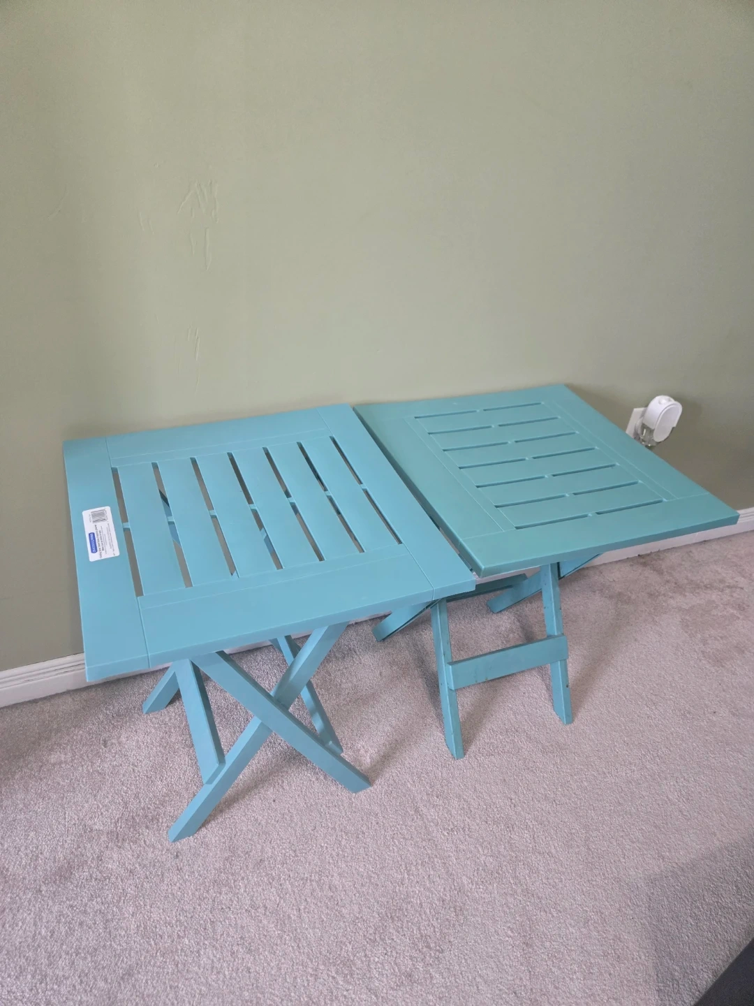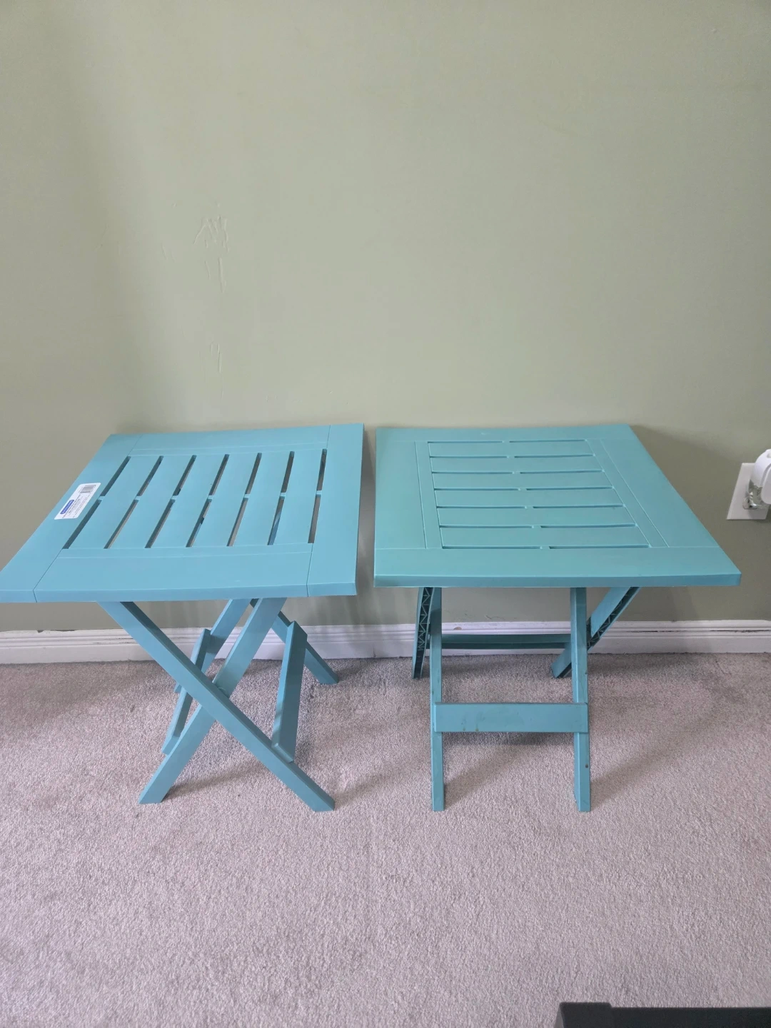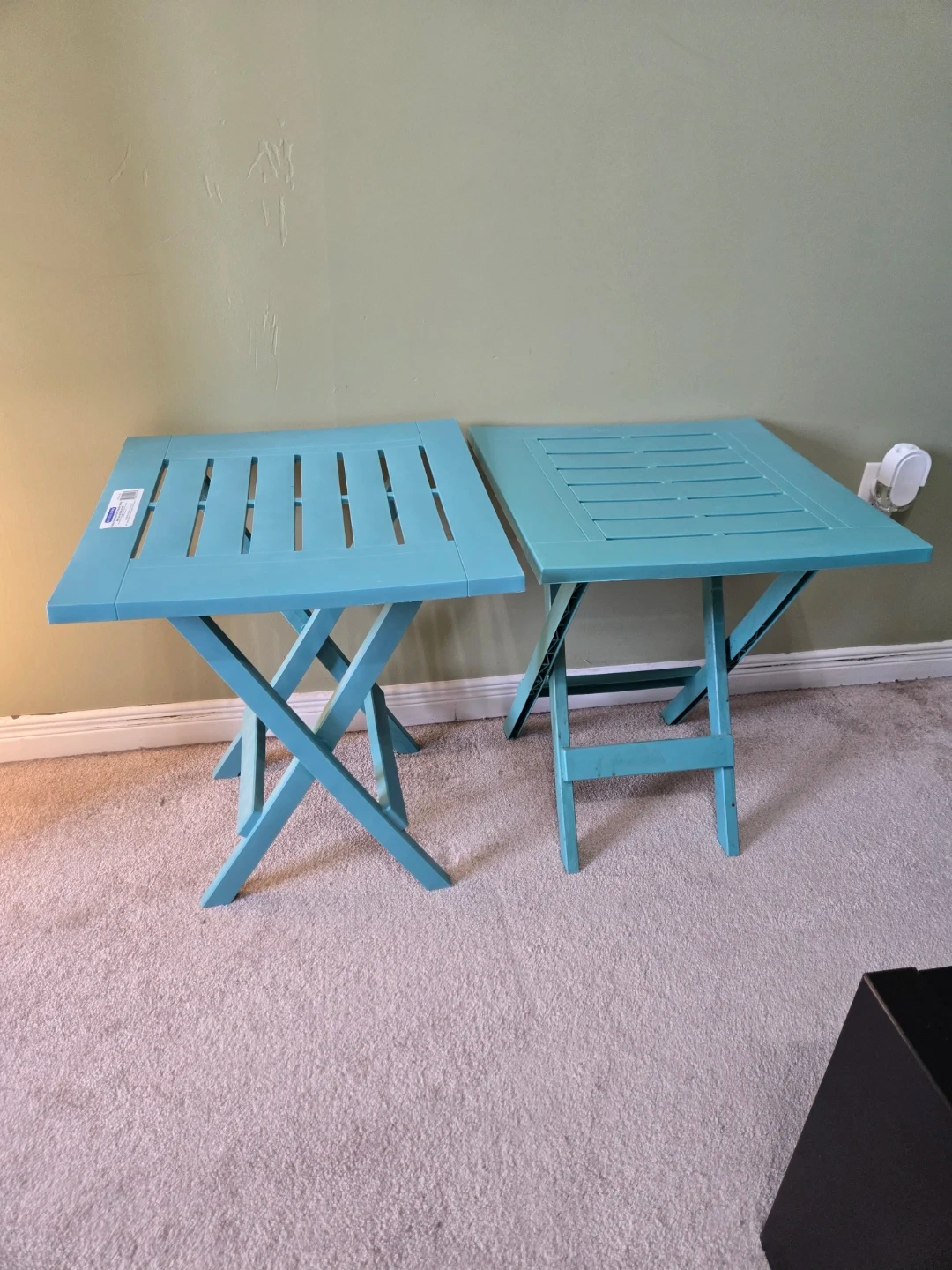 Two blue folding side tables. Perfect for outdoor use or small spaces. They're made of durable plastic and fold up for easy storage. Each table measures approximately 19.7" W x 17.7" D x 20.5" H.