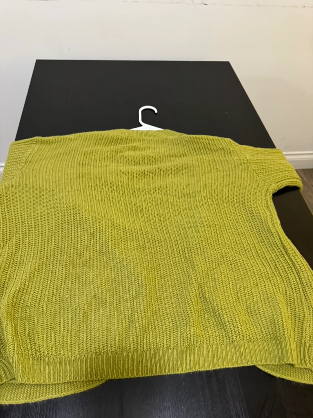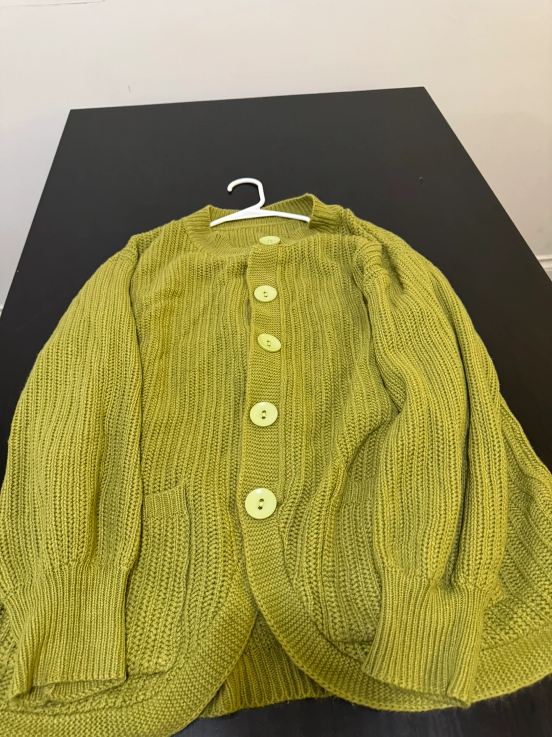 This is a classic button-up cardigan sweater in a vibrant lime green colour. It features a ribbed knit texture and two front pockets. The long sleeves add extra warmth and comfort.