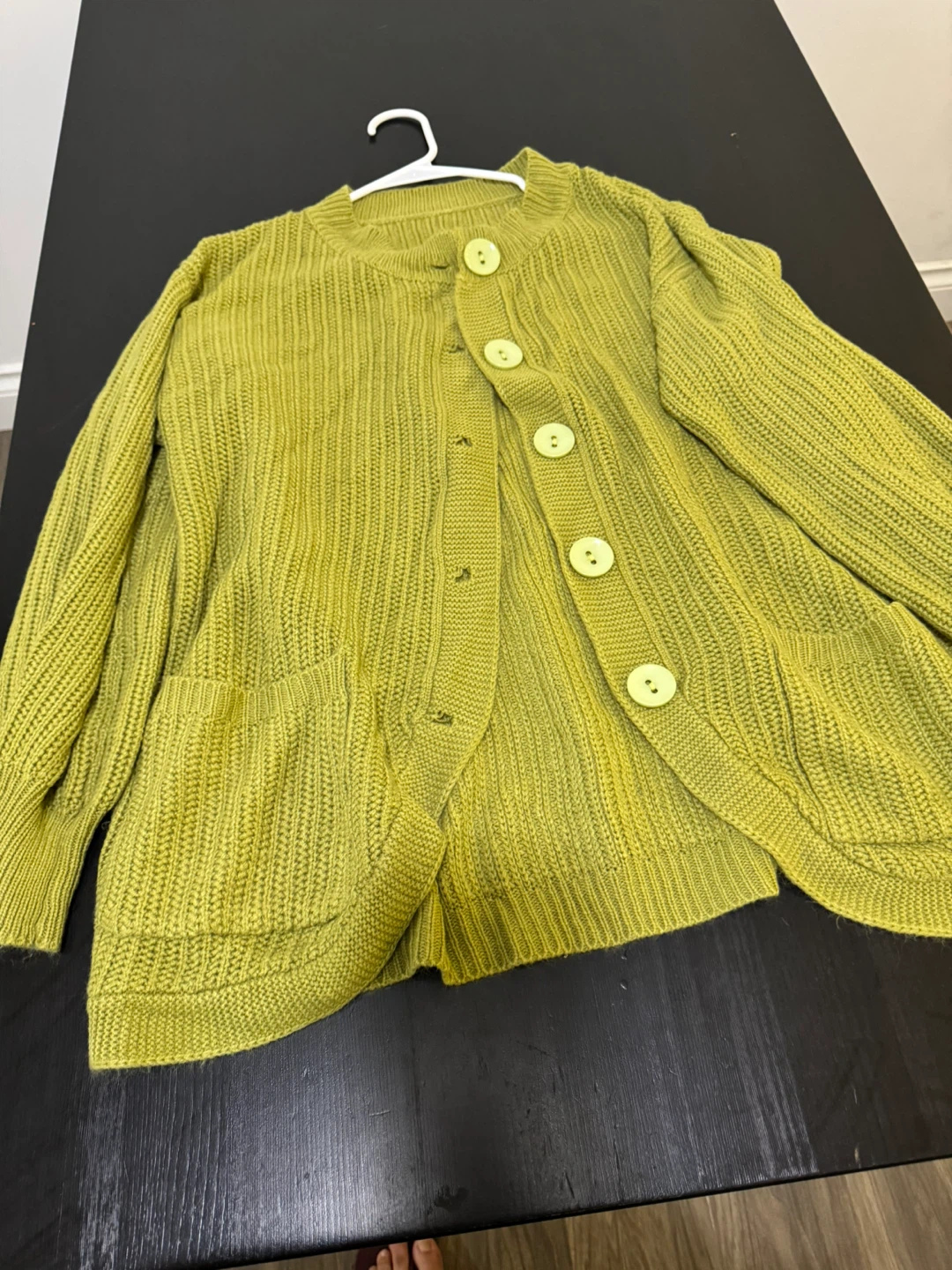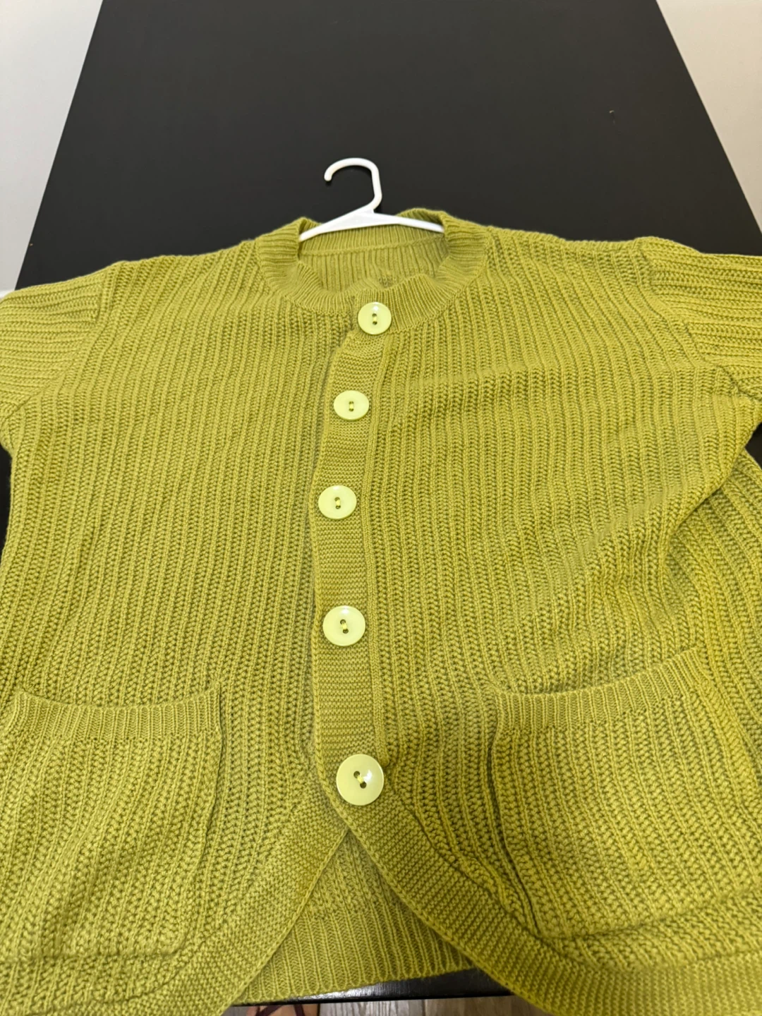 This is a classic button-up cardigan sweater in a vibrant lime green colour. It features a ribbed knit texture and two front pockets. The long sleeves add extra warmth and comfort.