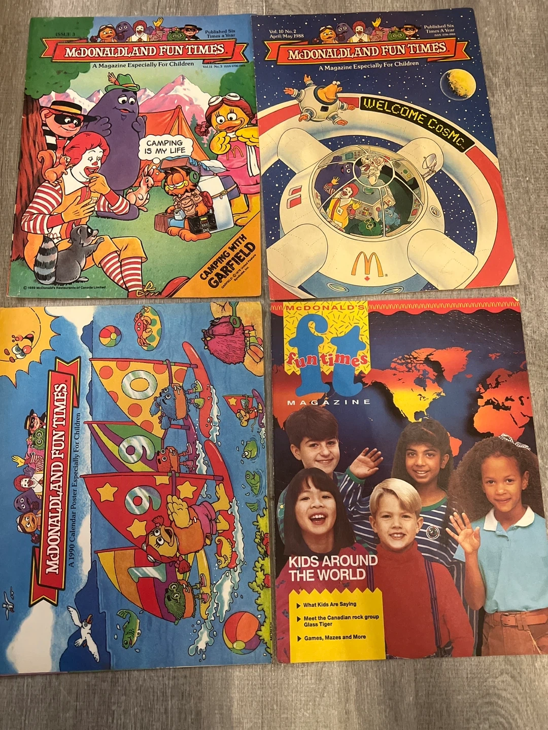 A collection of four McDonaldland Fun Times magazines, perfect for young fans! One issue from April/May 1988 features a space theme with Grimace and Hamburglar, and another from 1989 is a calendar poster with characters like Big Bird and the Cookie Monster. Two other issues include themes like 'Camping with Garfield' and 'Kids Around the World'.