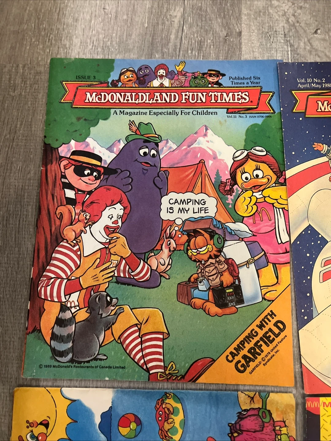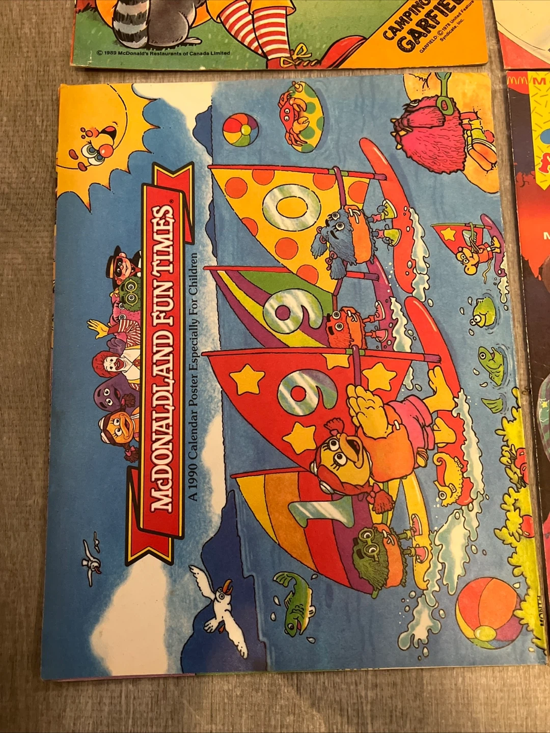 A collection of four McDonaldland Fun Times magazines, perfect for young fans! One issue from April/May 1988 features a space theme with Grimace and Hamburglar, and another from 1989 is a calendar poster with characters like Big Bird and the Cookie Monster. Two other issues include themes like 'Camping with Garfield' and 'Kids Around the World'.