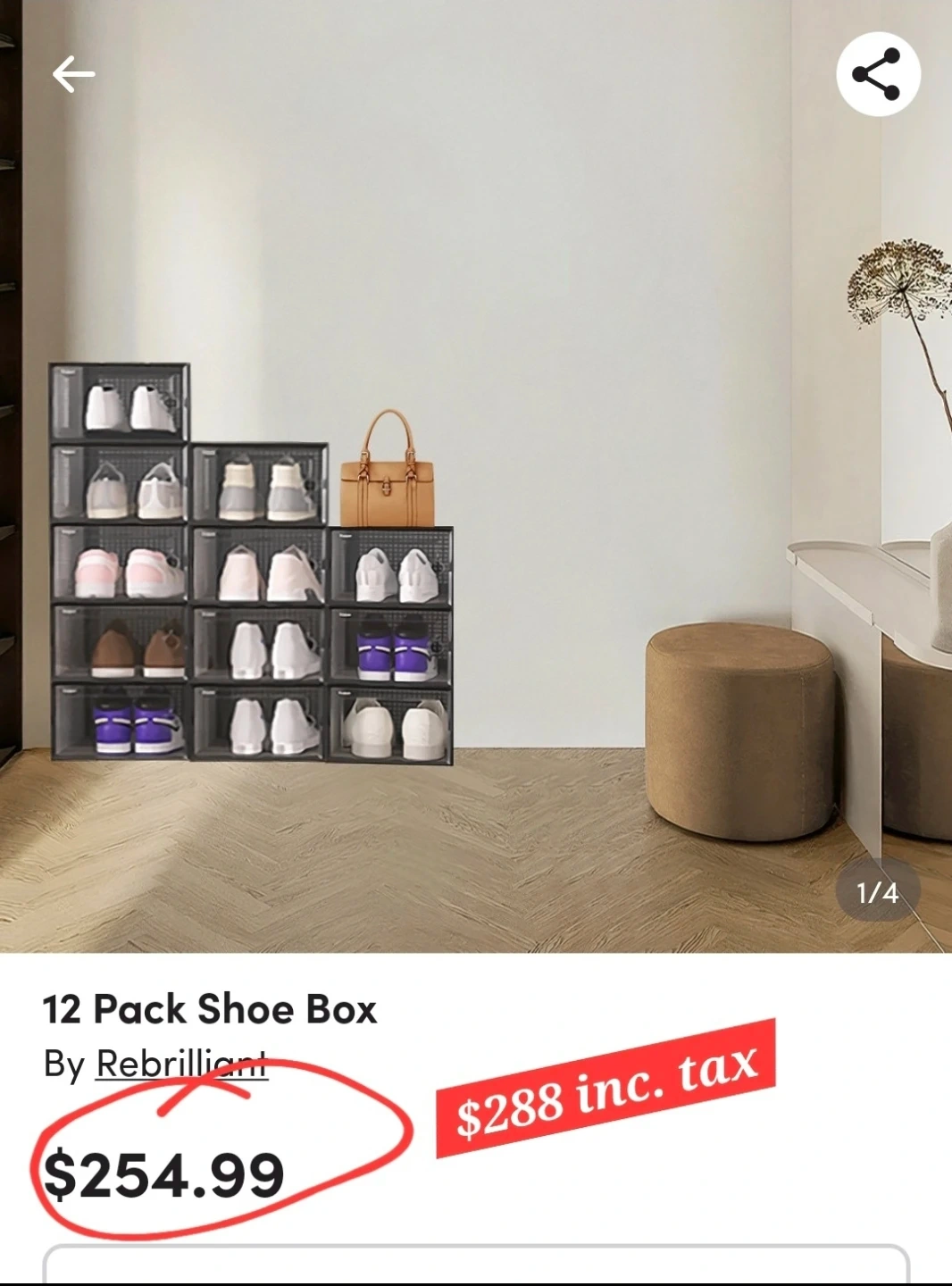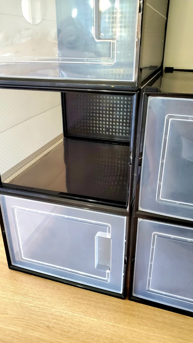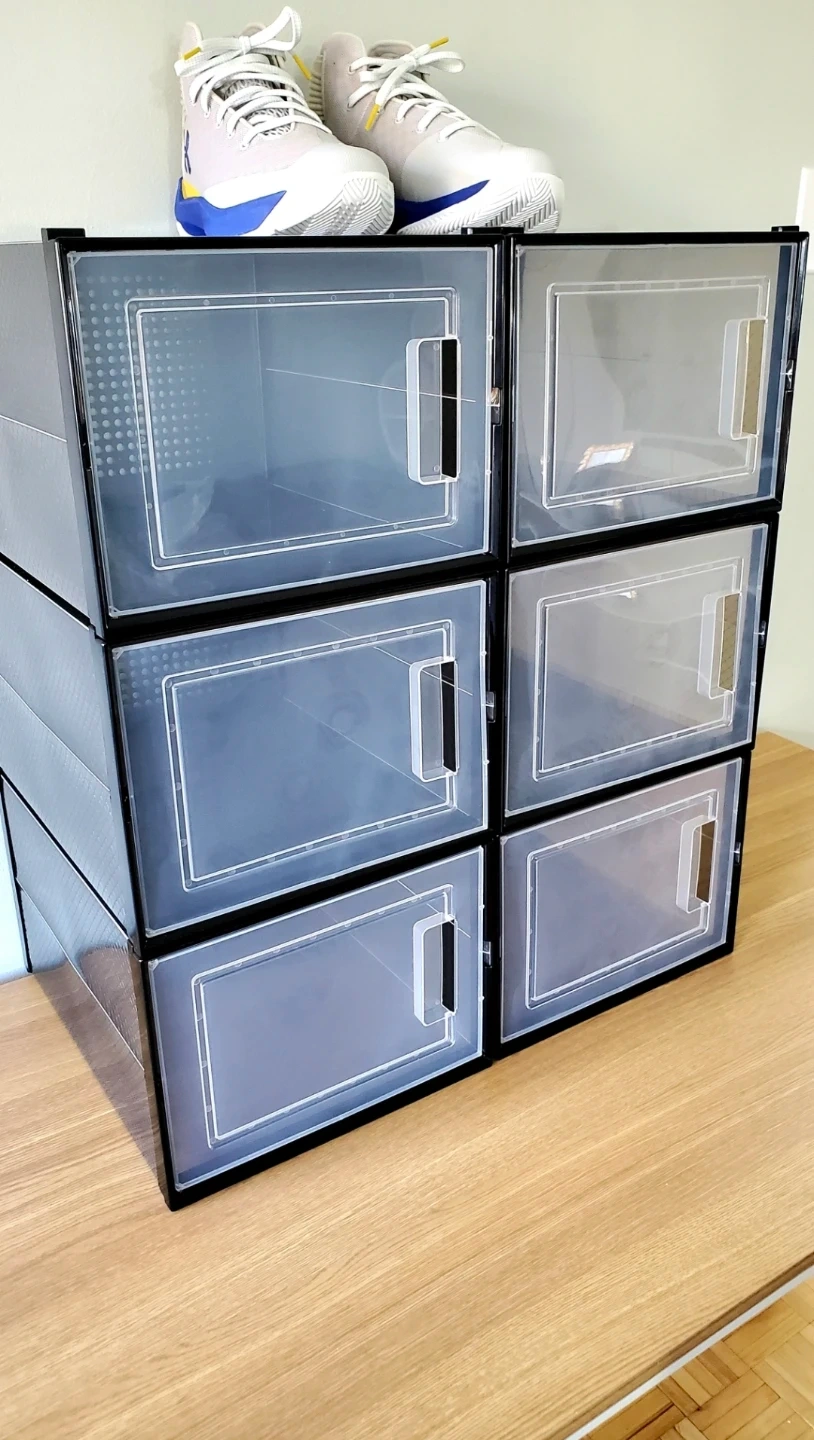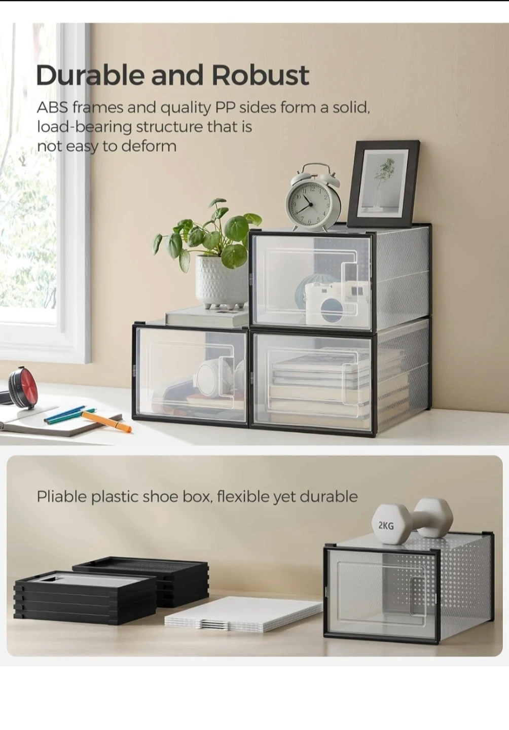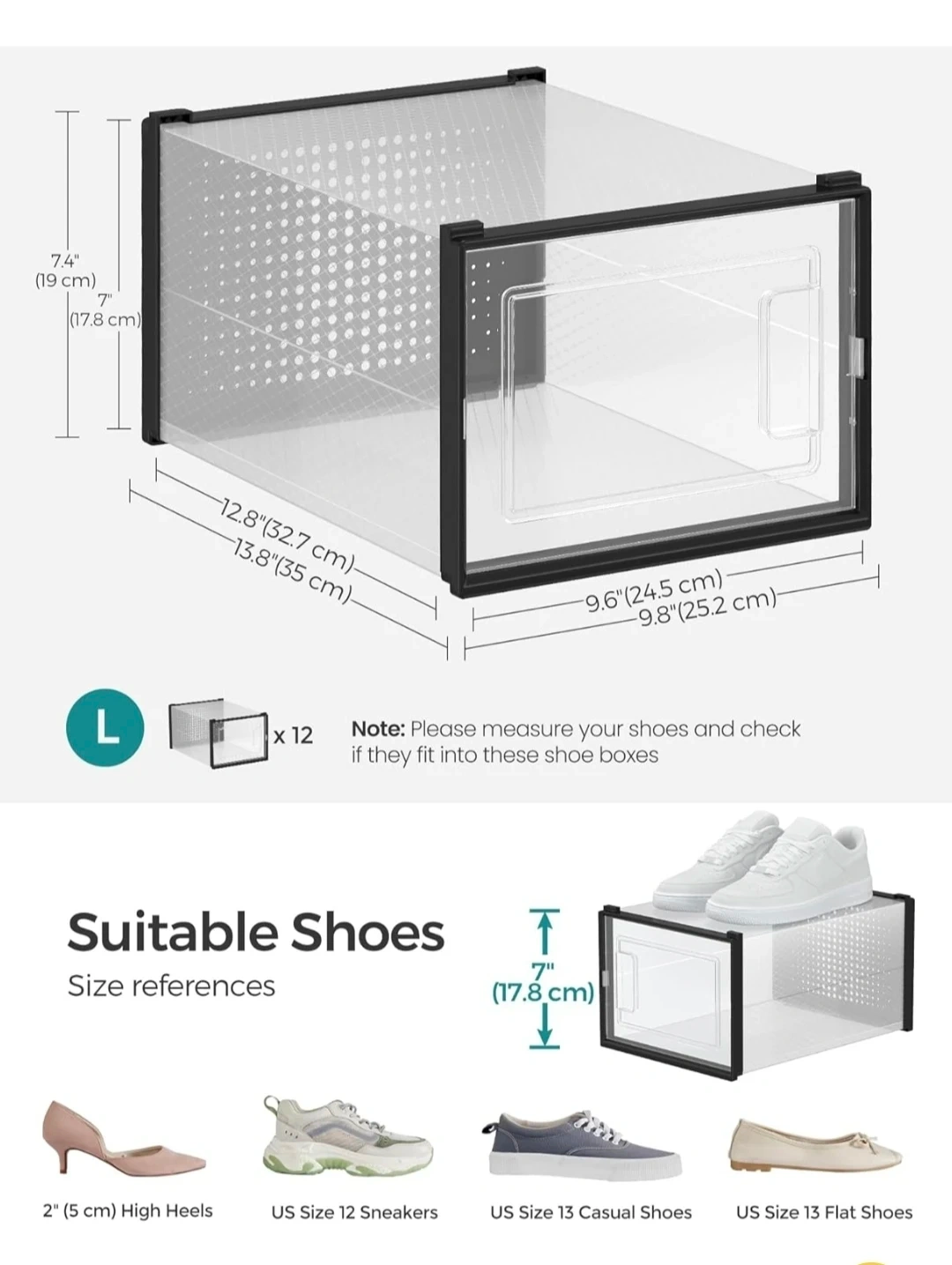 This 12-pack of shoe storage boxes are brand new still in box, and can be used to organize shoes clothes, cosmetics, etc. The black translucent design allows you to see what's inside. The boxes can hold weight, and they are stackable to each other. Each one has a large size (my sample shoe is 9.5 mens, but women's shoes will even fit more) It can hold up to size 12/13, and you can see dimensions in one of my photos.