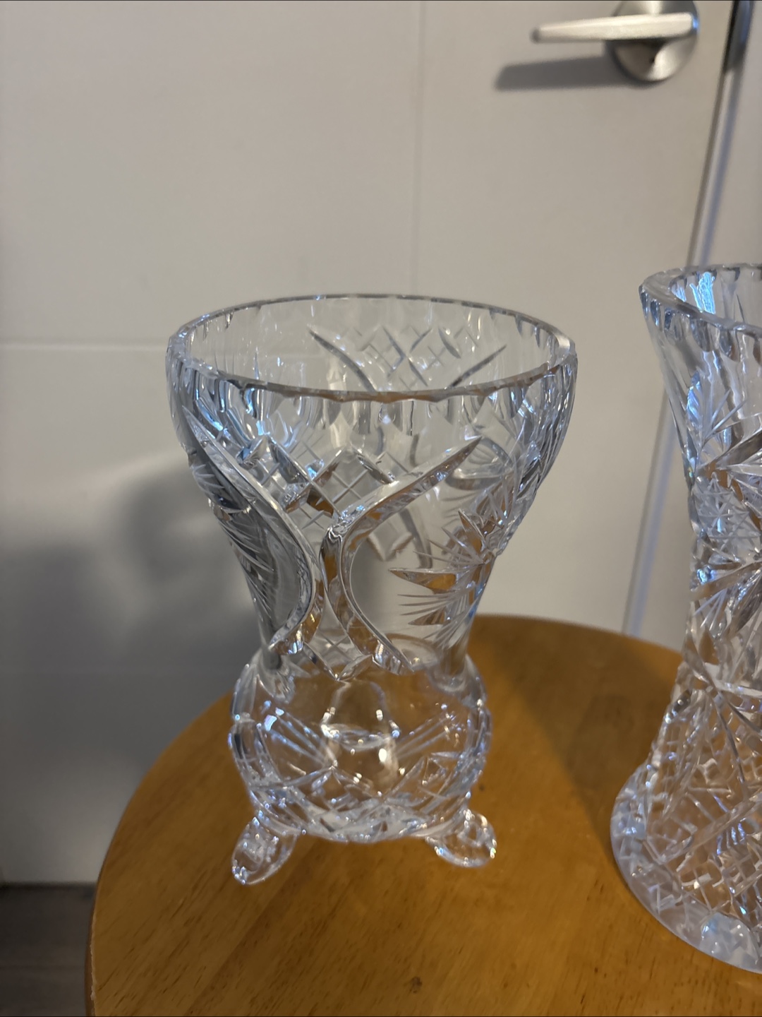 Two lovely crystal vases. One sits on three feet. Both feature intricate cut detailing. Elegant decor pieces.