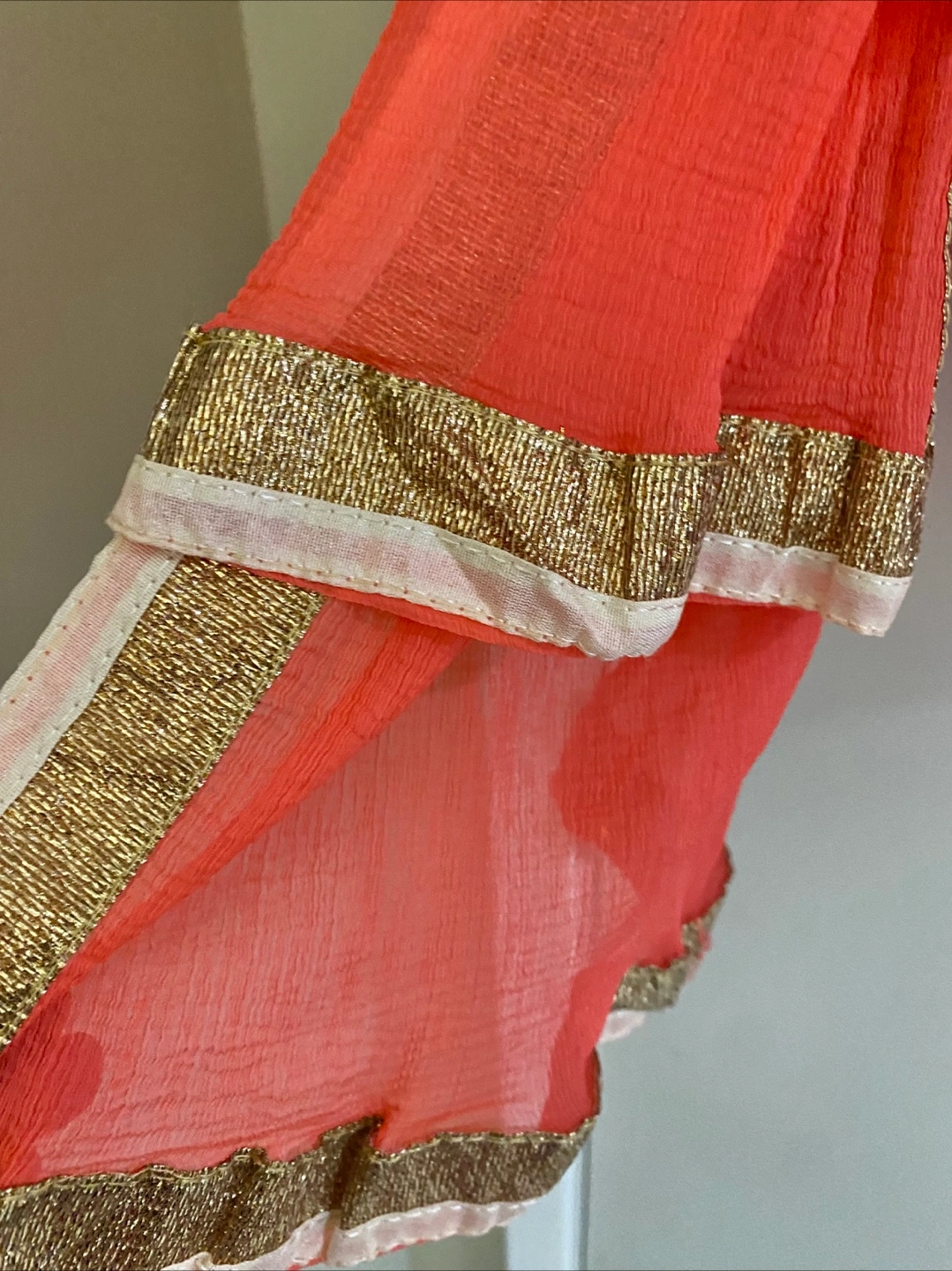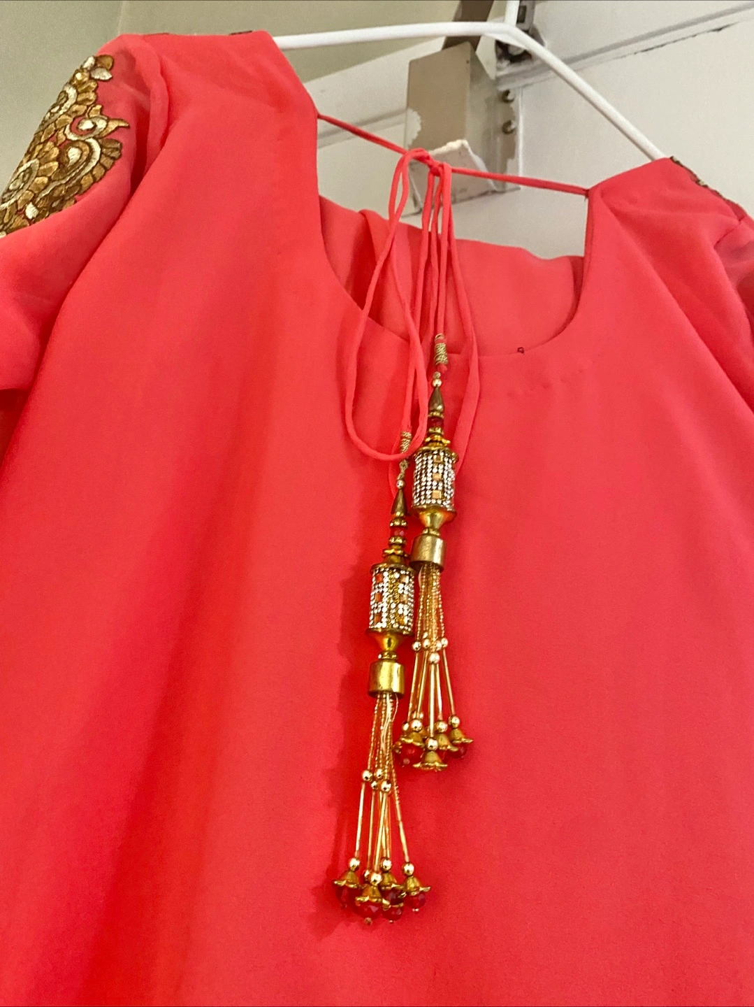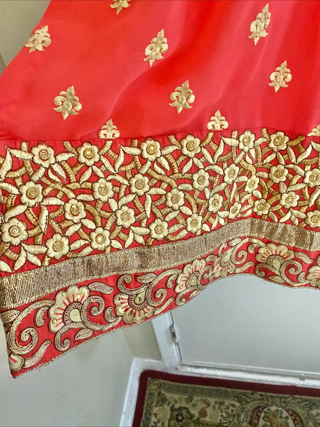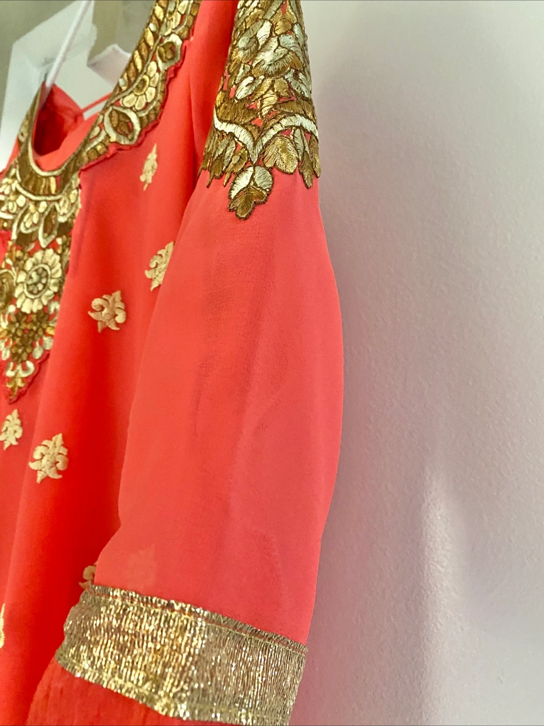 Beautiful coral dress with intricate gold embroidery! It's in great condition and ready for a new home. Perfect for a special occasion or just feeling fancy.