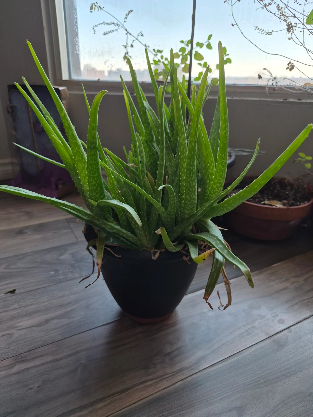Healthy aloe vera plant in a black pot. It's easy to care for and a popular houseplant. This plant's gel is known for its soothing properties.