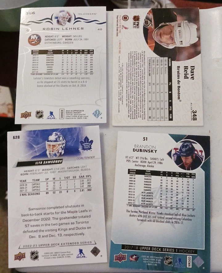 This collection features four NHL hockey cards: Dave Reid, Brandon Dubinsky, Robin Lehner, and Ilya Samsonov. Each card includes player stats and team information on the back. A great addition for any hockey fan!