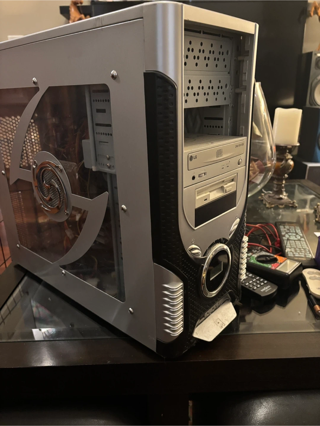 Selling a custom-built PC tower with a unique silver and black design. It features a windowed side panel and a decorative fan grill. Includes LG CDRW drive, video card, power supply. Perfect for someone looking for a distinctive case!