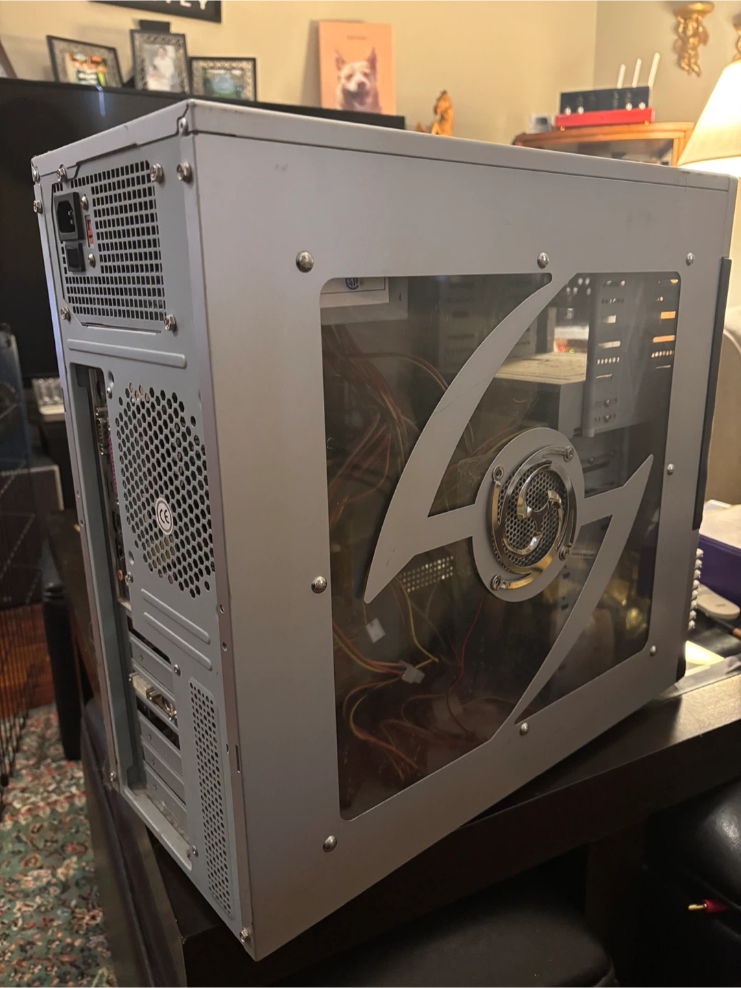 Selling a custom-built PC tower with a unique silver and black design. It features a windowed side panel and a decorative fan grill. Includes LG CDRW drive, video card, power supply. Perfect for someone looking for a distinctive case!