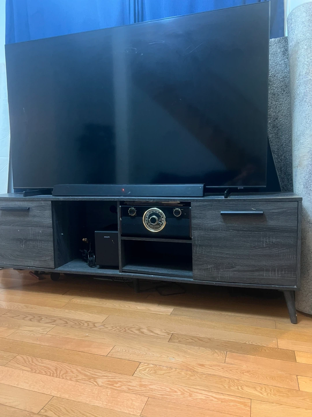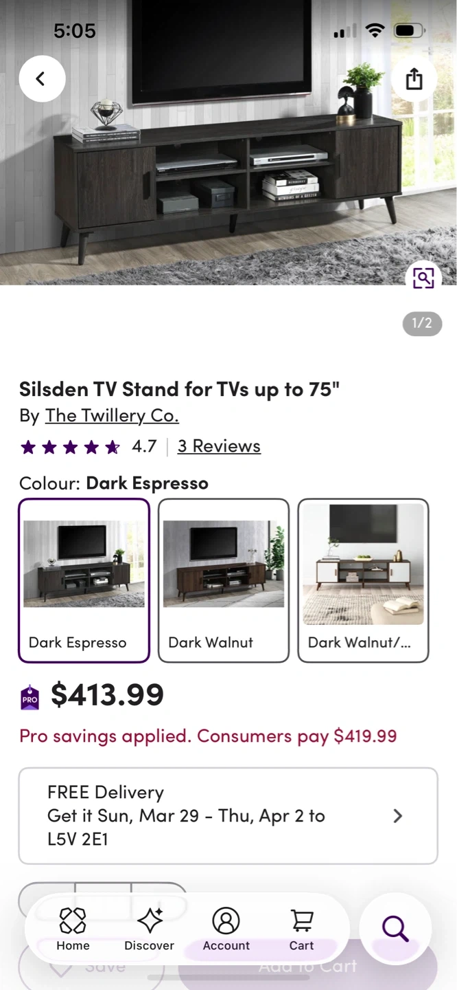 This Silsden TV stand is designed for TVs up to 75". It features a dark espresso finish with ample storage space. The unit has two cabinets with doors and open shelving for media consoles or decor.