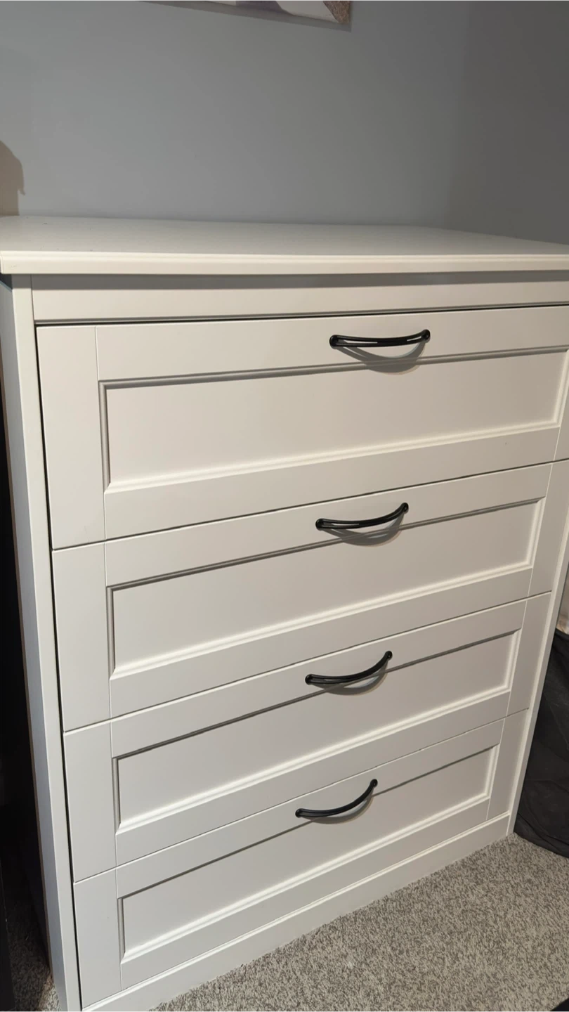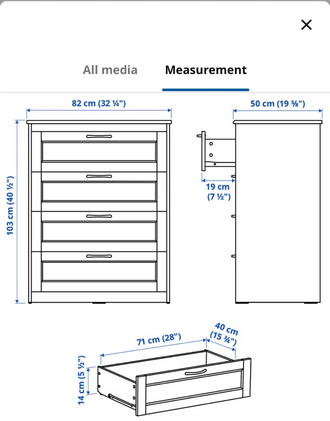 White 5-drawer dresser from IKEA's HEMNES series. It's 82cm wide, 50cm deep, and 103cm high. Drawer interiors are 71cm wide and 14cm deep. Great for storing clothes or linens!