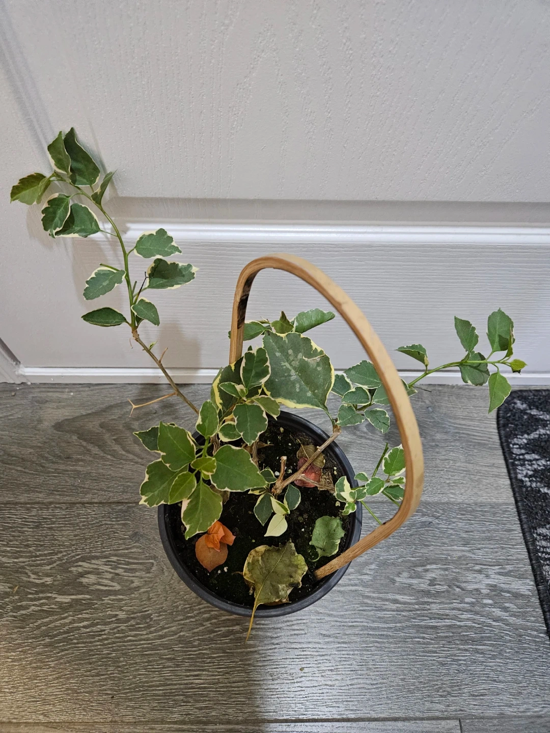 A lovely variegated Bougainvillea plant in a dark pot. It's got a unique wooden handle attached to the rim. Perfect for adding some greenery to your space! Bring some life into any room with this vibrant plant.