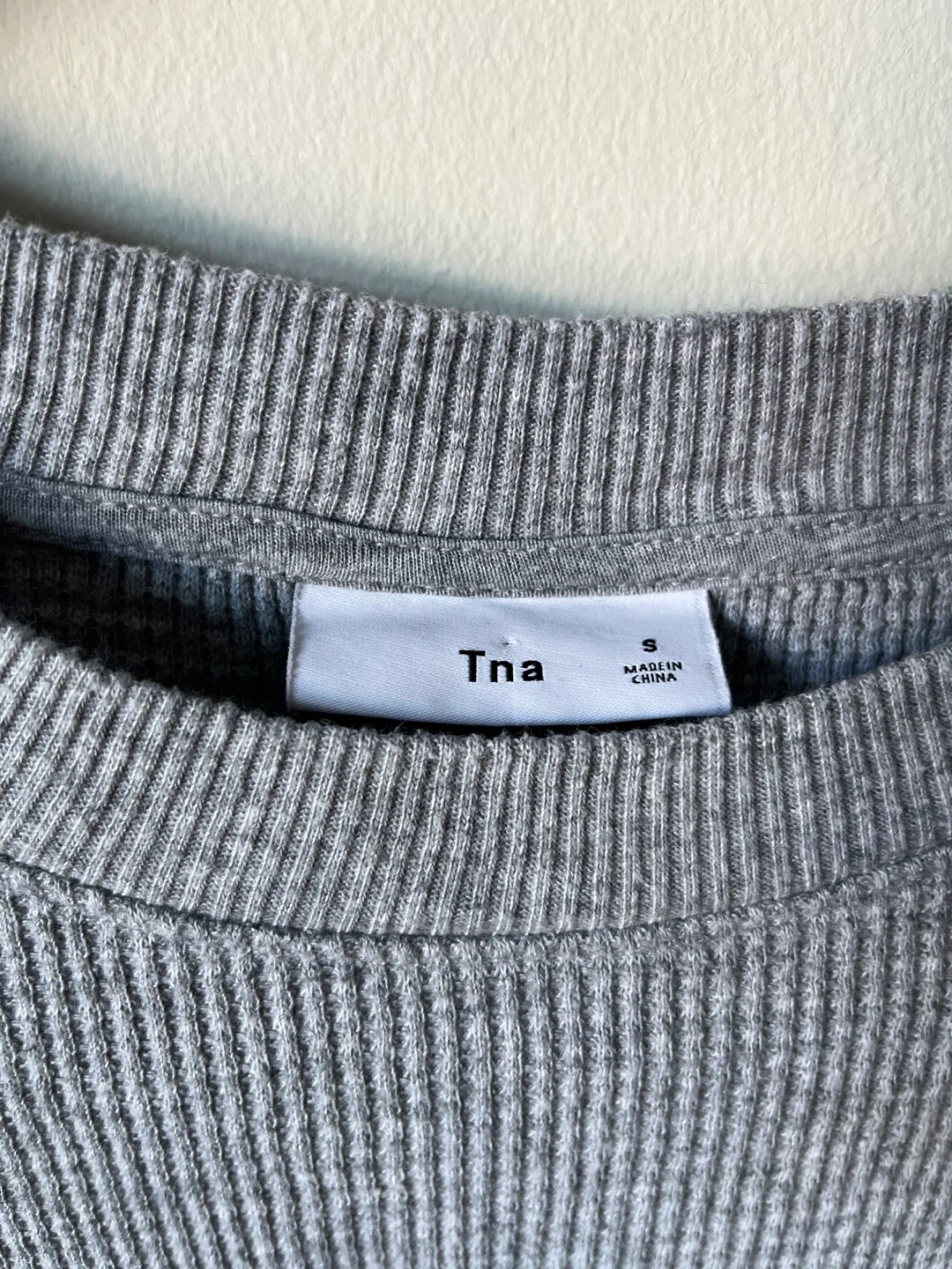 Has a crew-neck collar and ribbed material in a light grey colour.