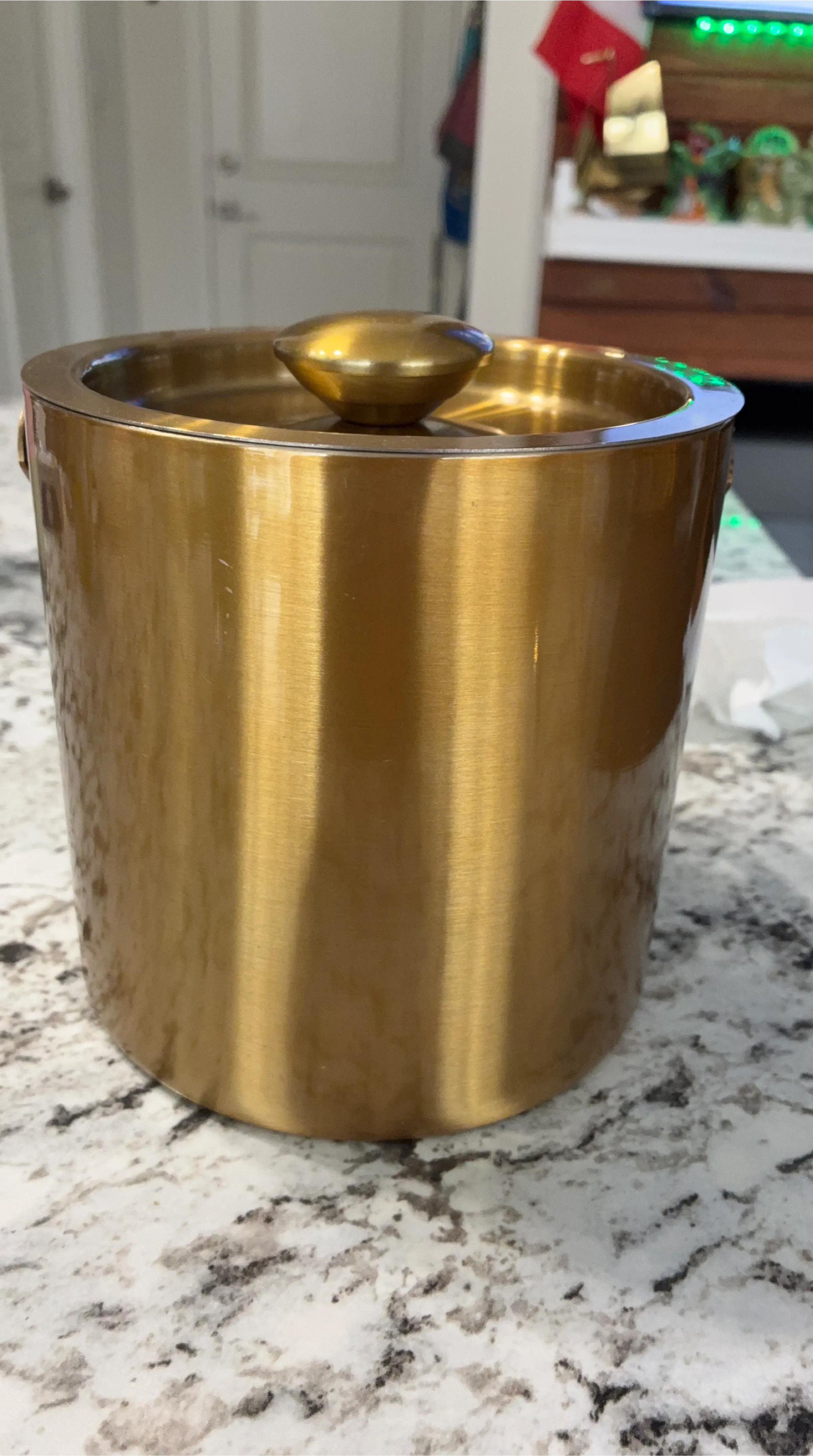 This ice bucket is gold-coloured and comes with a matching lid. It's made of metal and features a textured exterior. Perfect for keeping drinks chilled at gatherings!