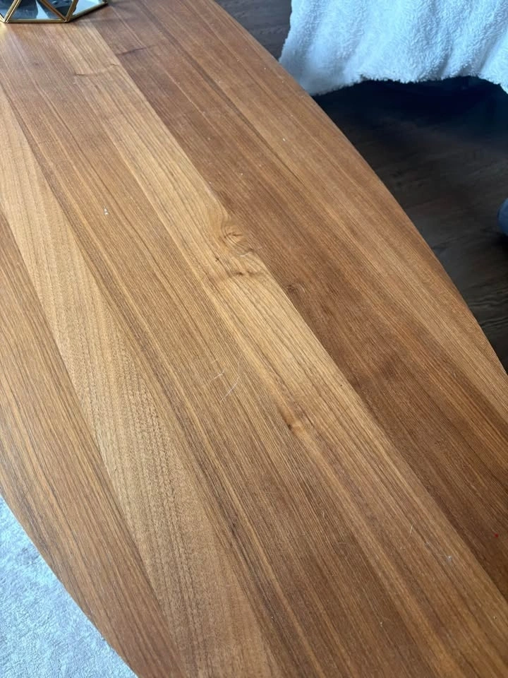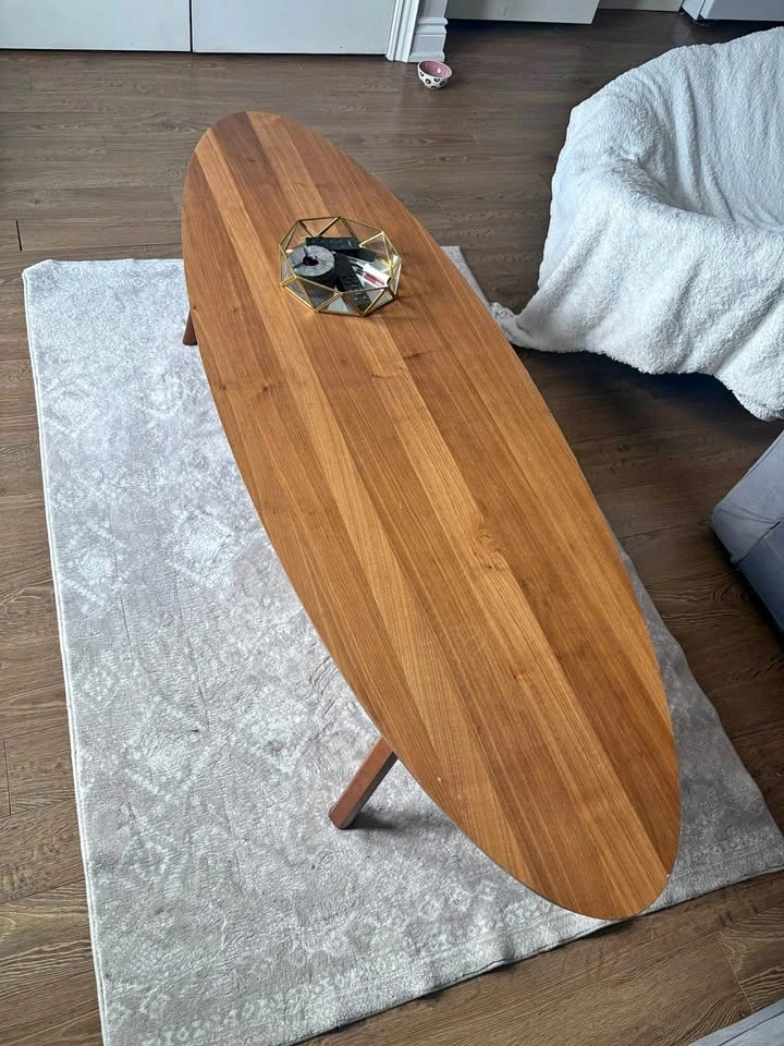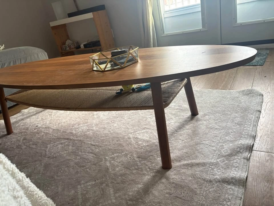 Beautiful IKEA STOCKHOLM oval coffee table made of solid wood veneer. Timeless Scandinavian design with a surfboard-style shape — warm, elegant, and easy to style in any living room.