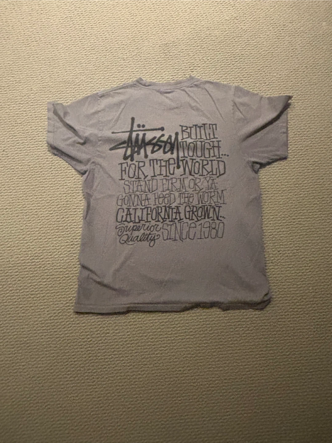 This is a Stüssy graphic t-shirt. It's grey and made of cotton. Made in Honduras. This shirt features St üssy branding and graphic text on the back. It's a size small.
