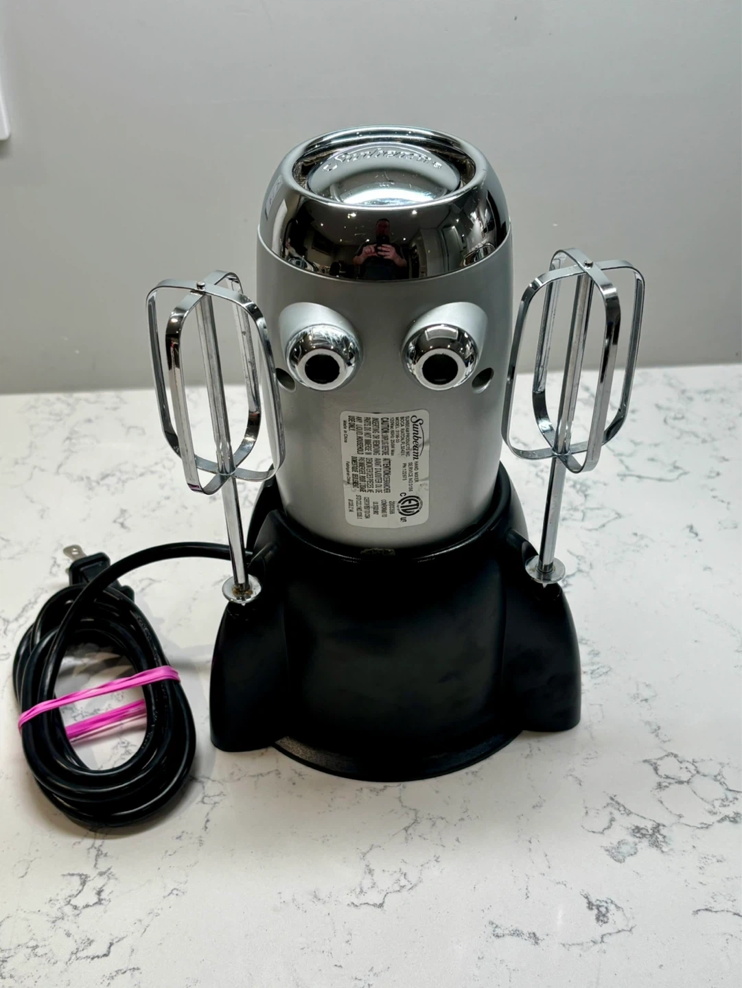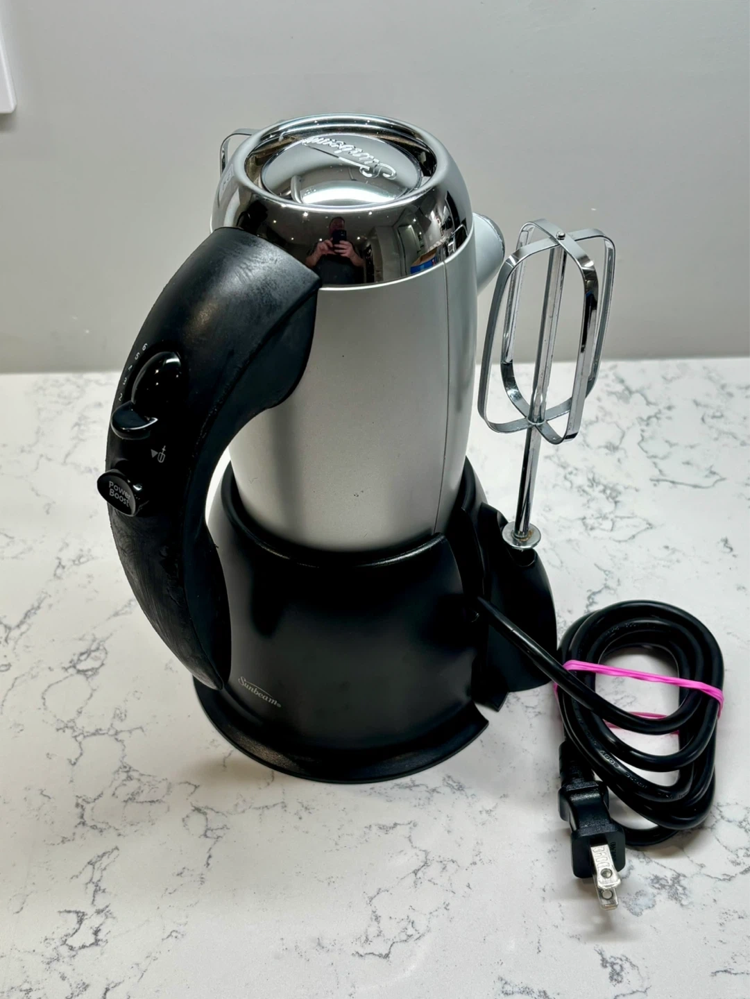 Sunbeam hand mixer, model 3156-33. It features a silver and black design with multiple speed settings and a power boost button. Includes original beaters and power cord.