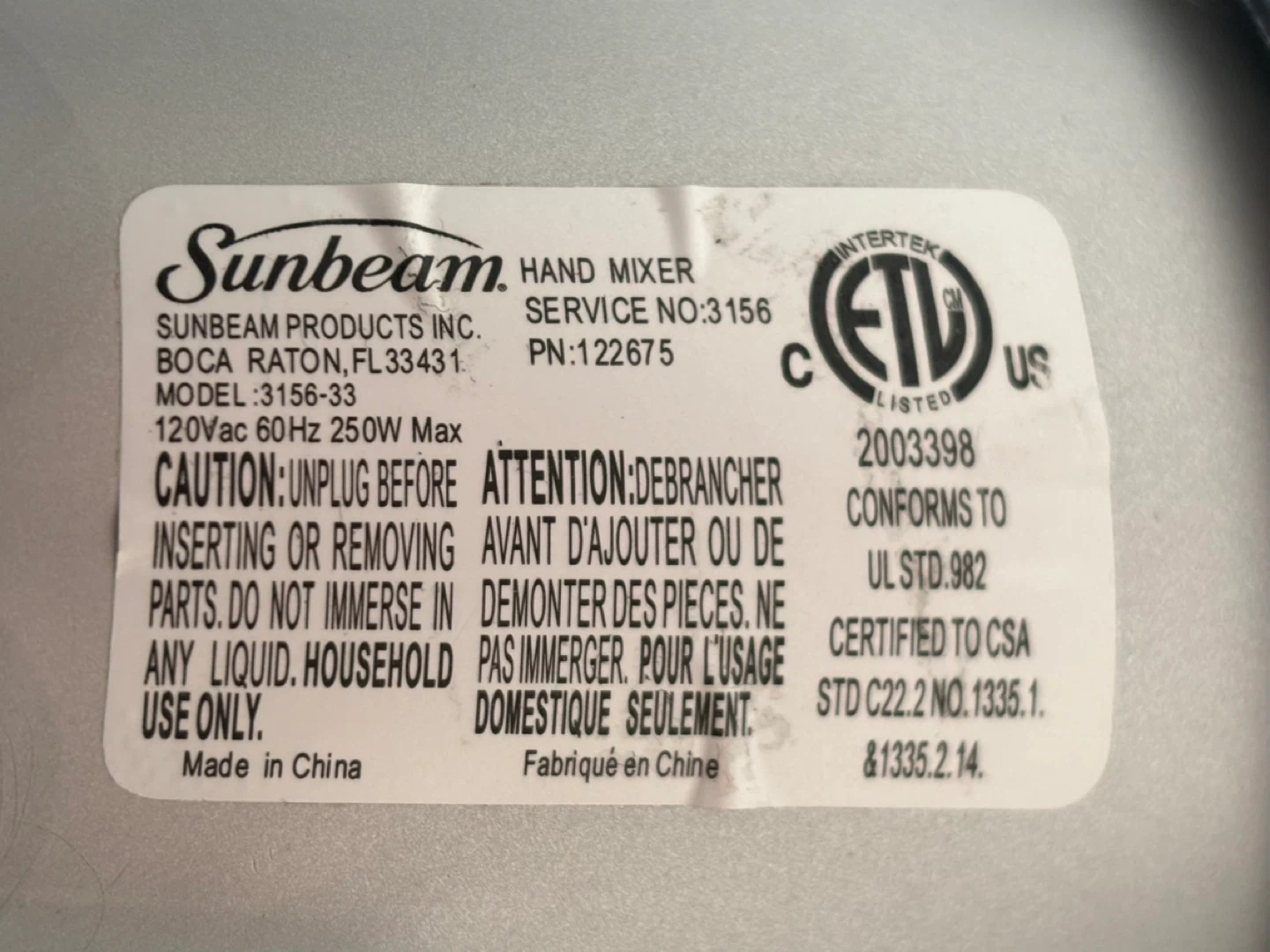 Hand Mixer Sunbeam Model 3156-33 Silver/Black