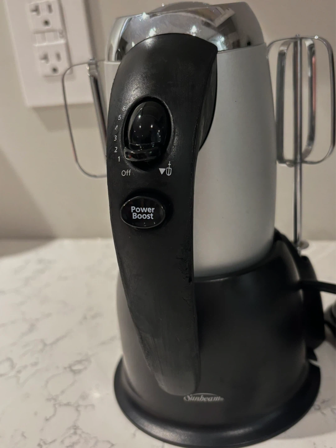 Sunbeam hand mixer, model 3156-33. It features a silver and black design with multiple speed settings and a power boost button. Includes original beaters and power cord.