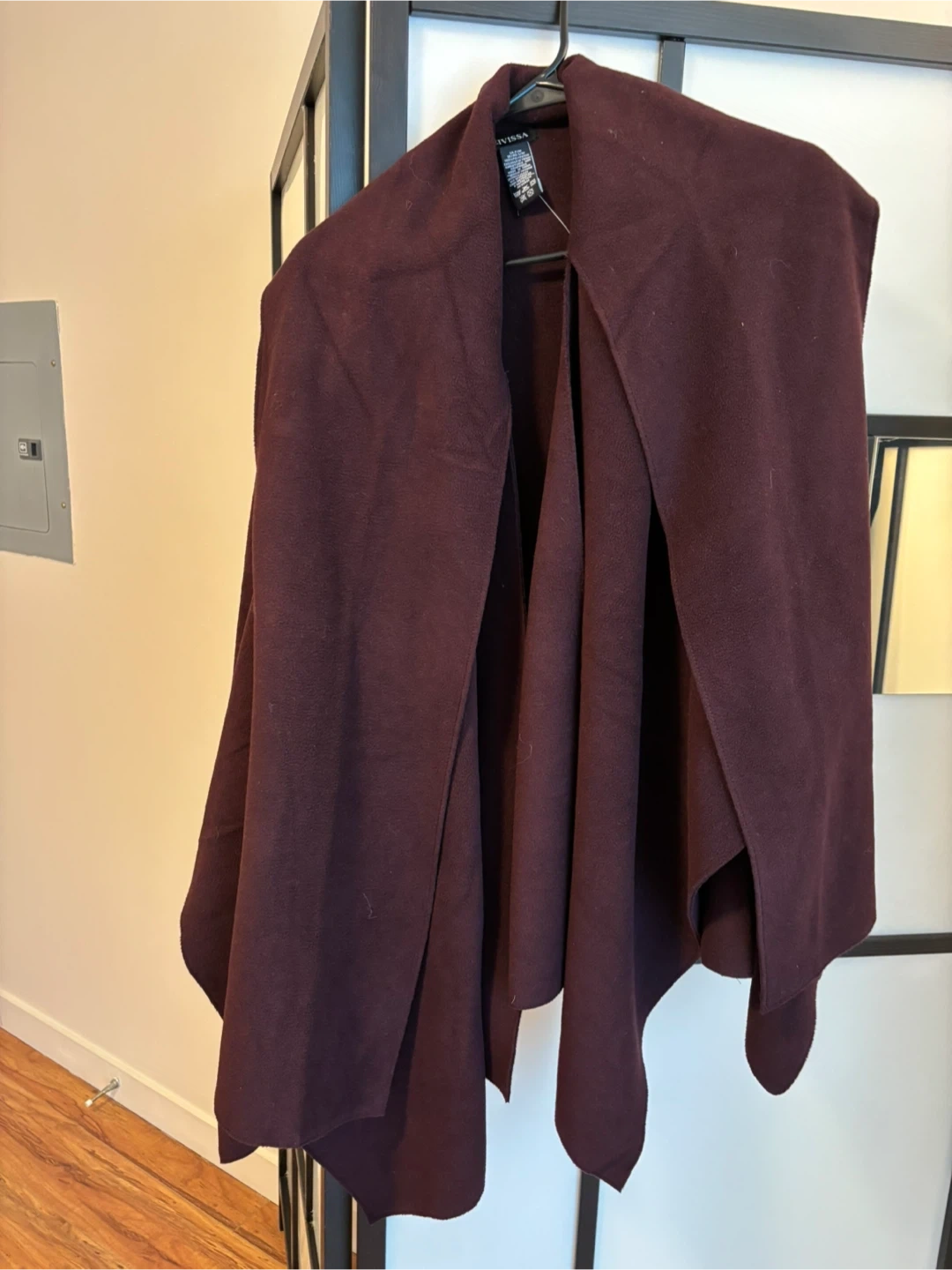 This EIVISSA cape is made of 100% polyester fleece. It's a size S/M and comes in a deep burgundy colour. Care instructions say to machine wash cold and tumble dry low.