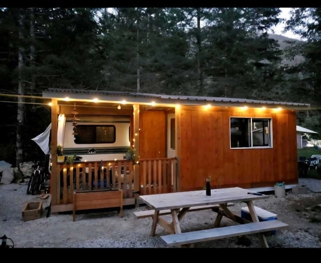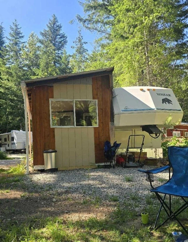 Cozy wooden cabin with picnic table and outdoor space with a fire pit. The cabin is well-maintained and has peaceful surroundings. Includes a 1997 Kodiac 5th wheel trailer with an addition room and porch. Located near Hope BC in a very quiet RV park. Monthly lot fee is $680, electricity is on a meter. Features a new queen-size bed, bathroom, kitchen, and living room. Ample space for you and your furry babies. Great for someone who enjoys a spiritualist lifestyle, yoga, quiet, and privacy. Camera at the front entrance and gates close at dark. Only message if you are serious.