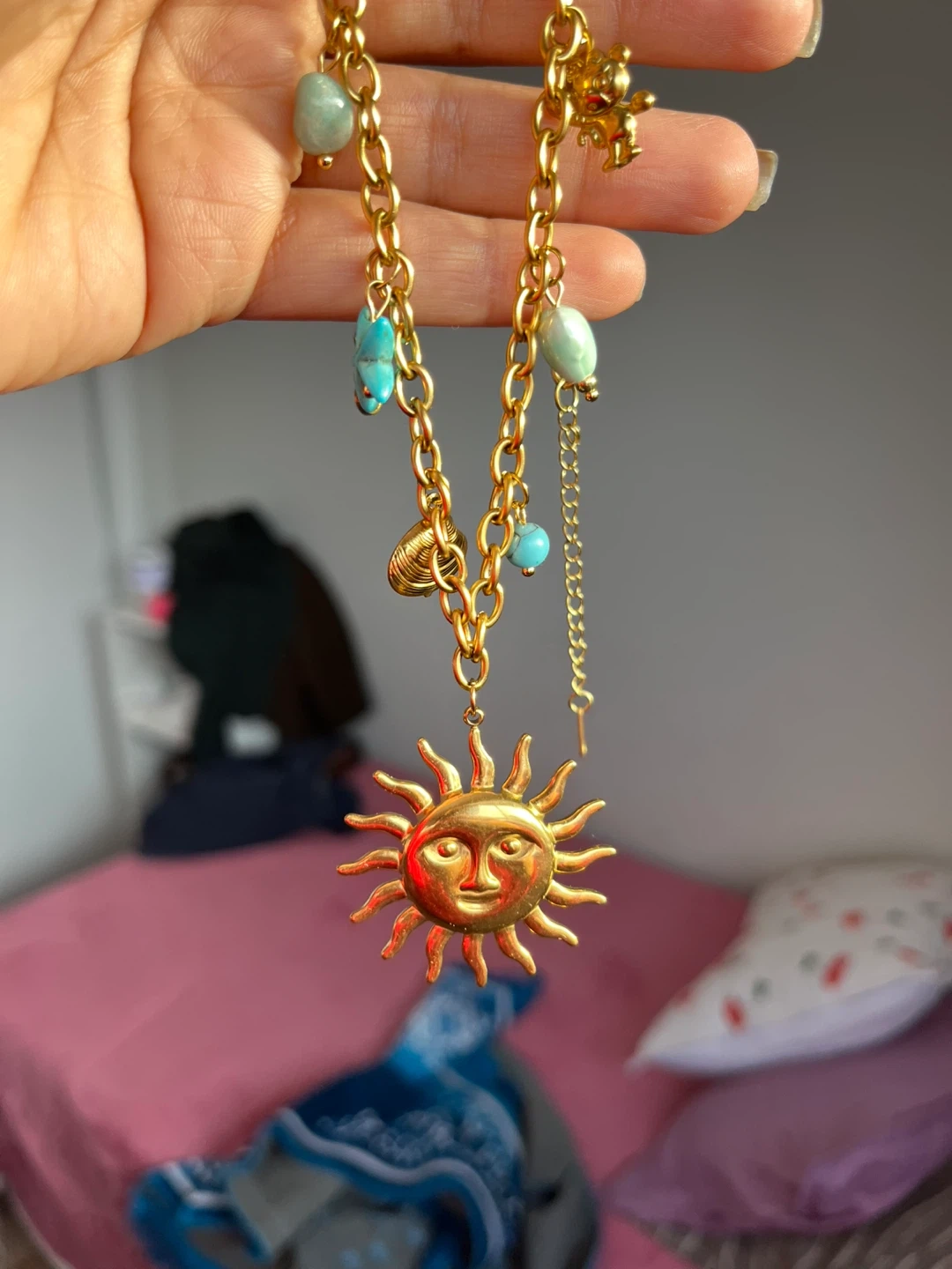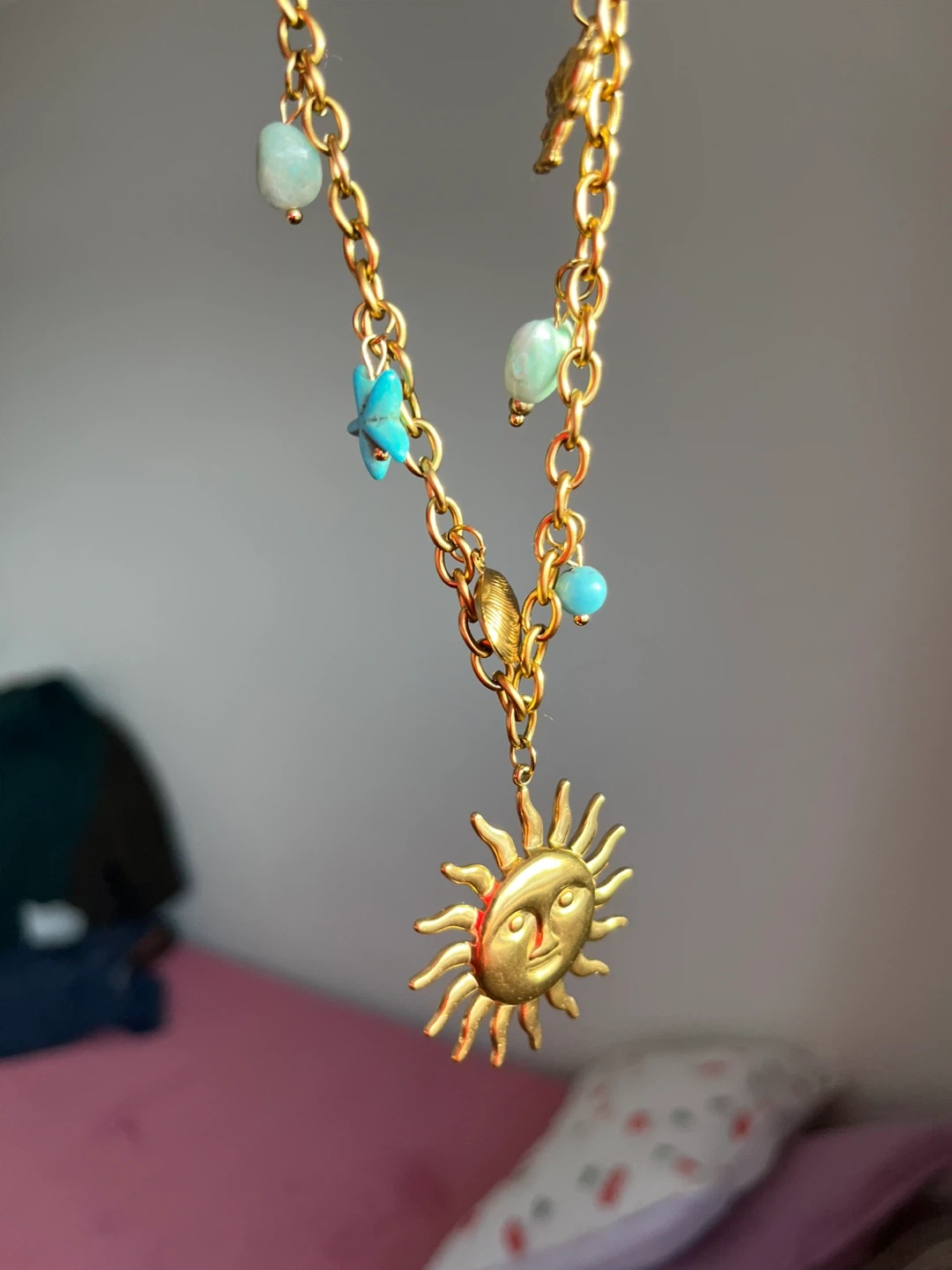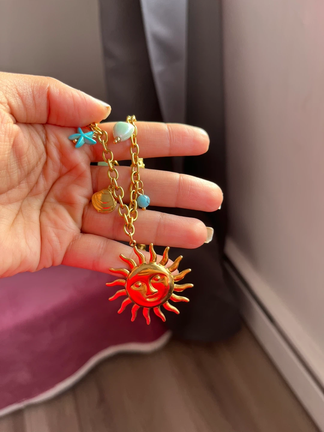 This is a cute gold-tone necklace with a sun charm. It also has little beads and charms like a starfish and seashell. It's in great condition and would be a fun addition to any outfit