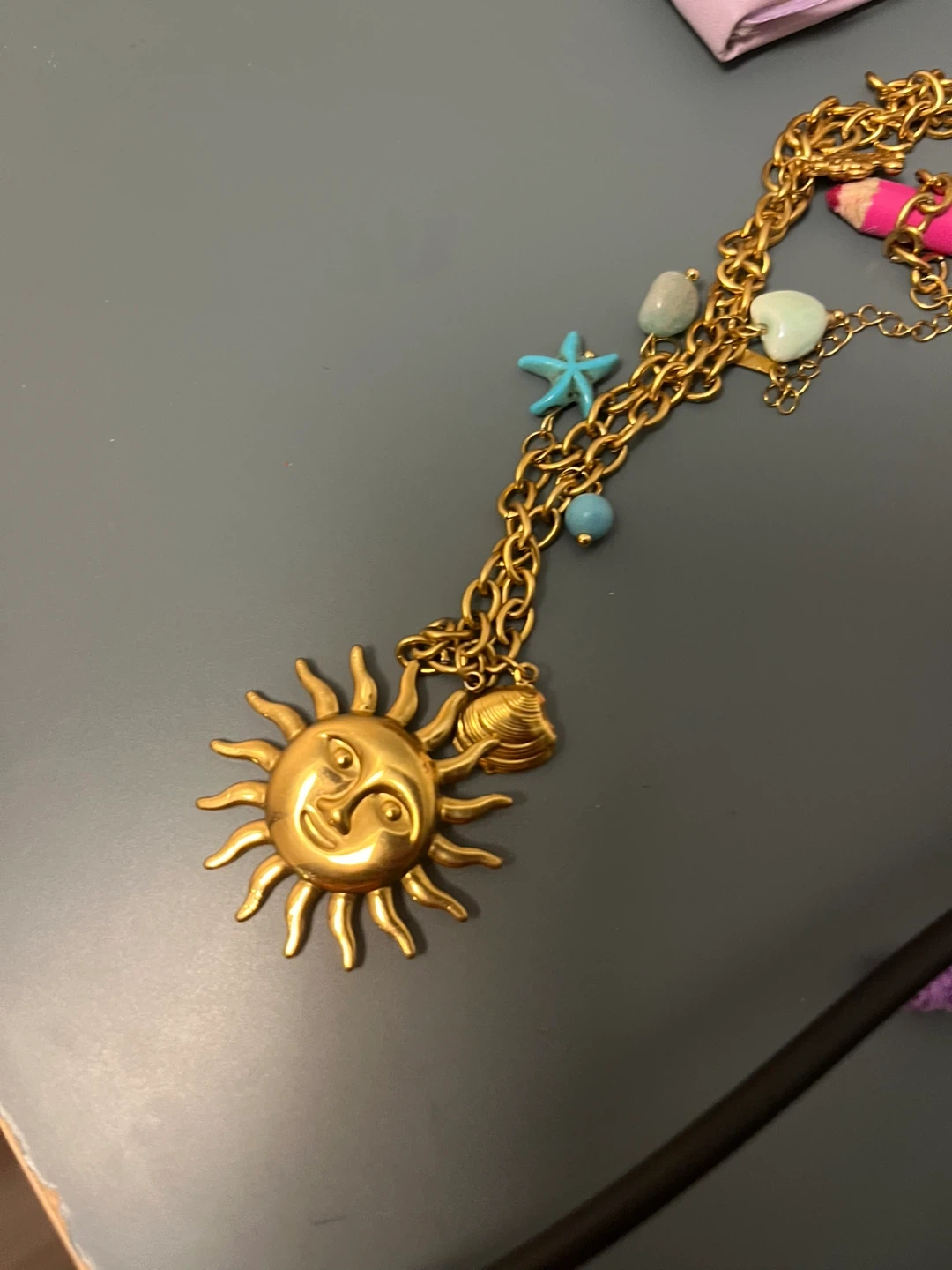 This is a cute gold-tone necklace with a sun charm. It also has little beads and charms like a starfish and seashell. It's in great condition and would be a fun addition to any outfit