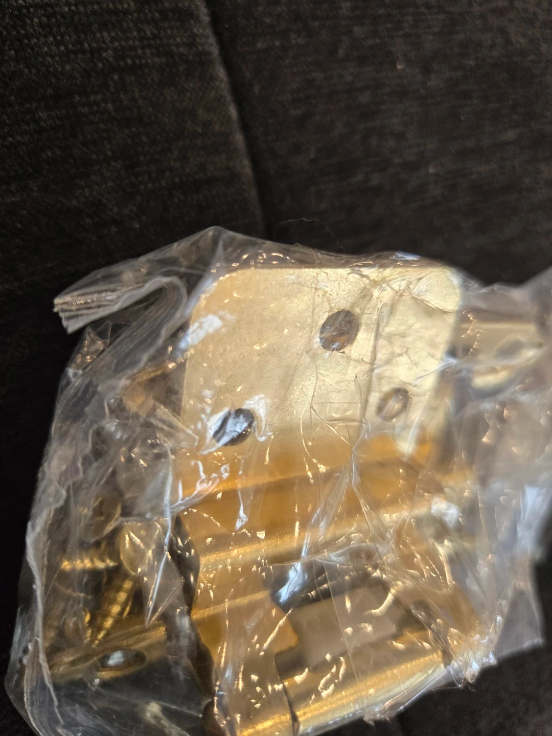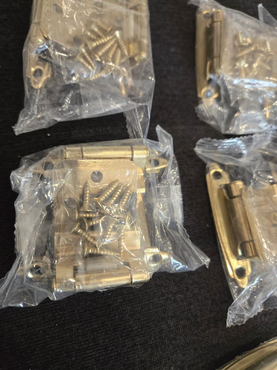 Four new brass cabinet hinges. Includes matching screws for installation. Small size, perfect for DIY furniture projects. Solid metal construction.total of 16pc included screws only $8