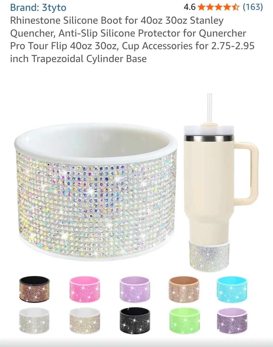 This 3tyto silicone boot is decorated with rhinestones, adding some sparkle to your tumbler. It's designed to protect the base of your cup and provide anti-slip properties. Fits 40oz and 30oz Quencher cups with a base diameter of 2.75-2.95 inches. It's great for adding a personal touch to your travel mug!