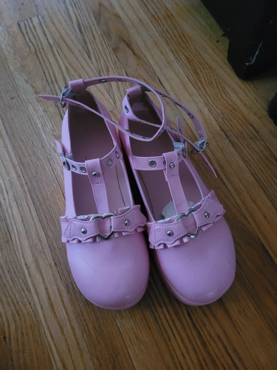 These pink Mary Jane platform shoes feature a cute ruffled design with buckle straps. The size is 41, indicated on the heel. They're made of faux leather and have a comfortable platform sole.