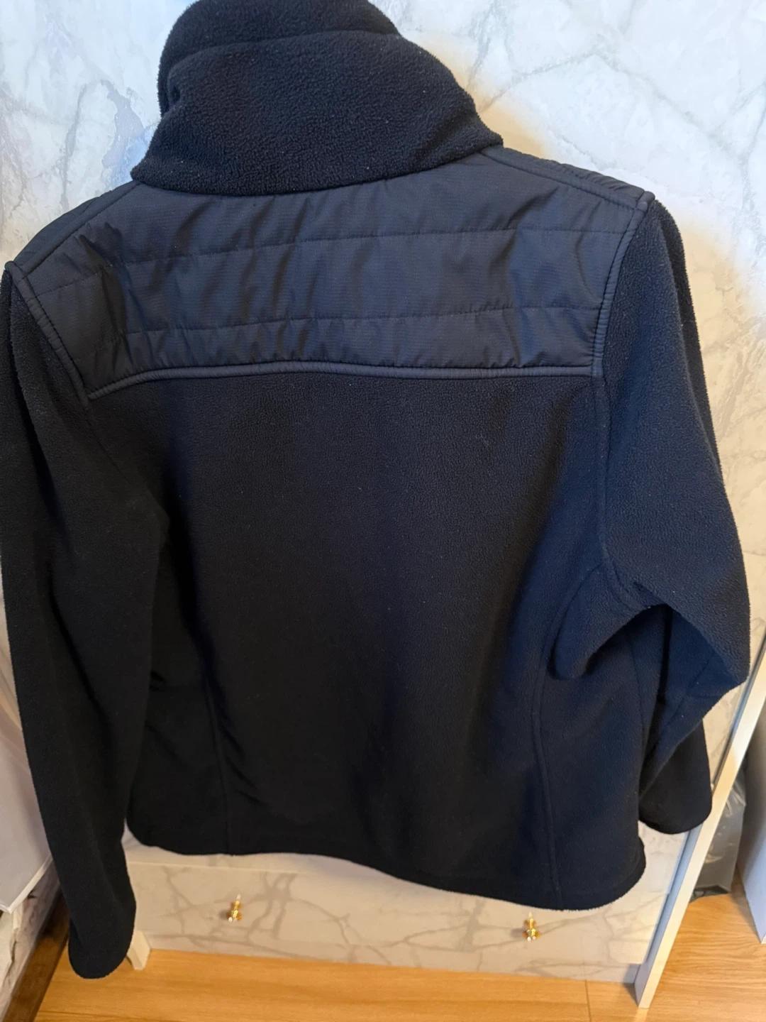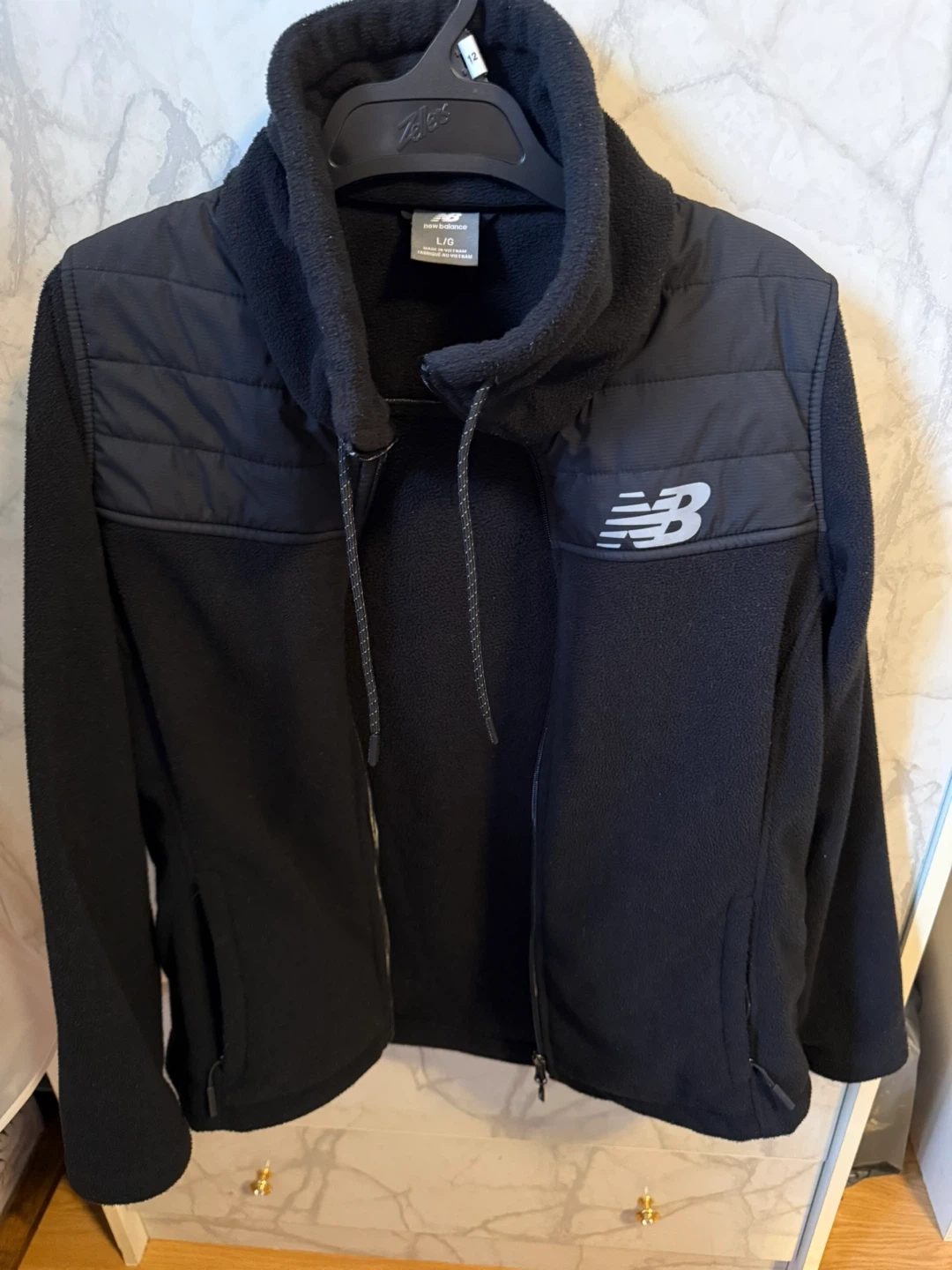 Black New Balance full-zip fleece jacket with a quilted chest panel. It's a size L/G. Great for layering during cooler weather! Perfect condition barely worn.