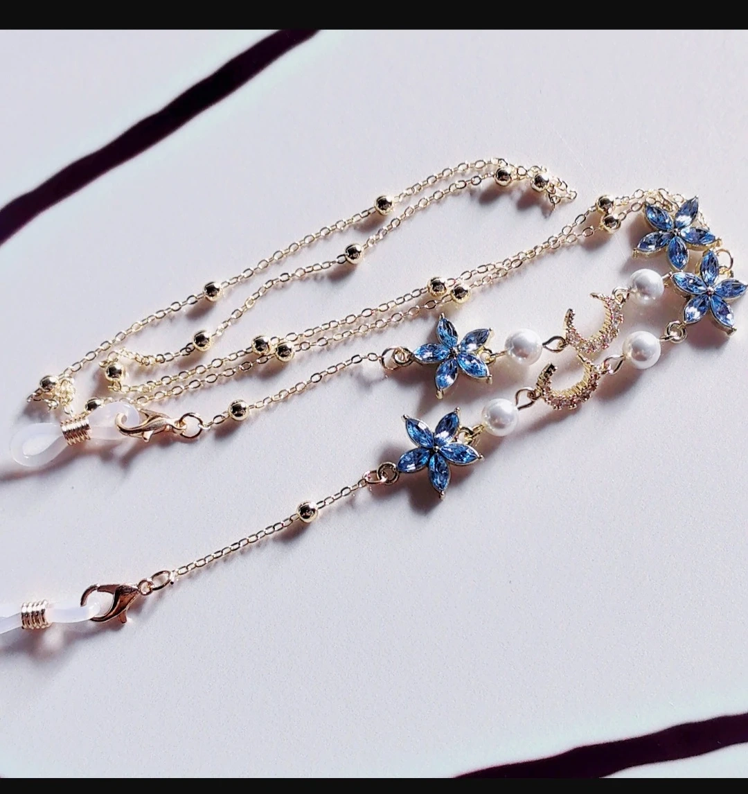This is a gold-tone chain designed to hold your glasses. It's embellished with blue crystal flower charms, faux pearls, and crescent moon details. Secure clasps attach to your eyewear.