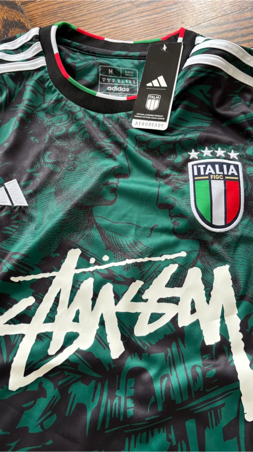 Green and black special edition soccer jersey. Collaboration between Italy, Stussy, and Adidas. Features Aeroready technology. Size medium. Slim fit. Comes with TAG STILL ON. Brand New.