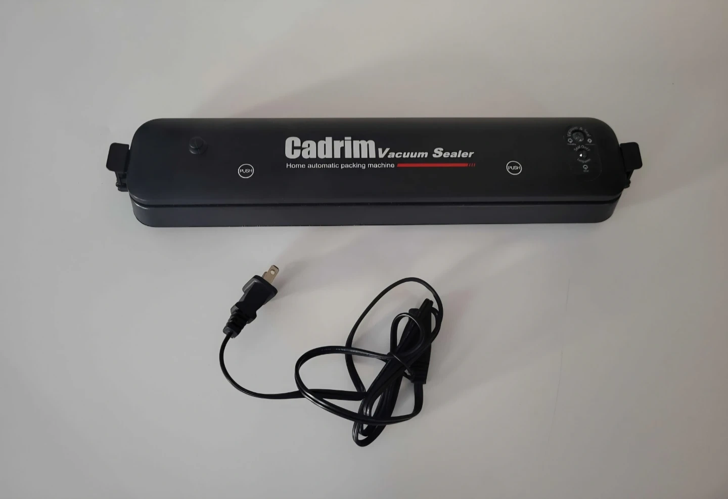 This is a black Cadrim vacuum sealer for home use. It's an automatic packing machine. Comes with power cord. Does not come with bag