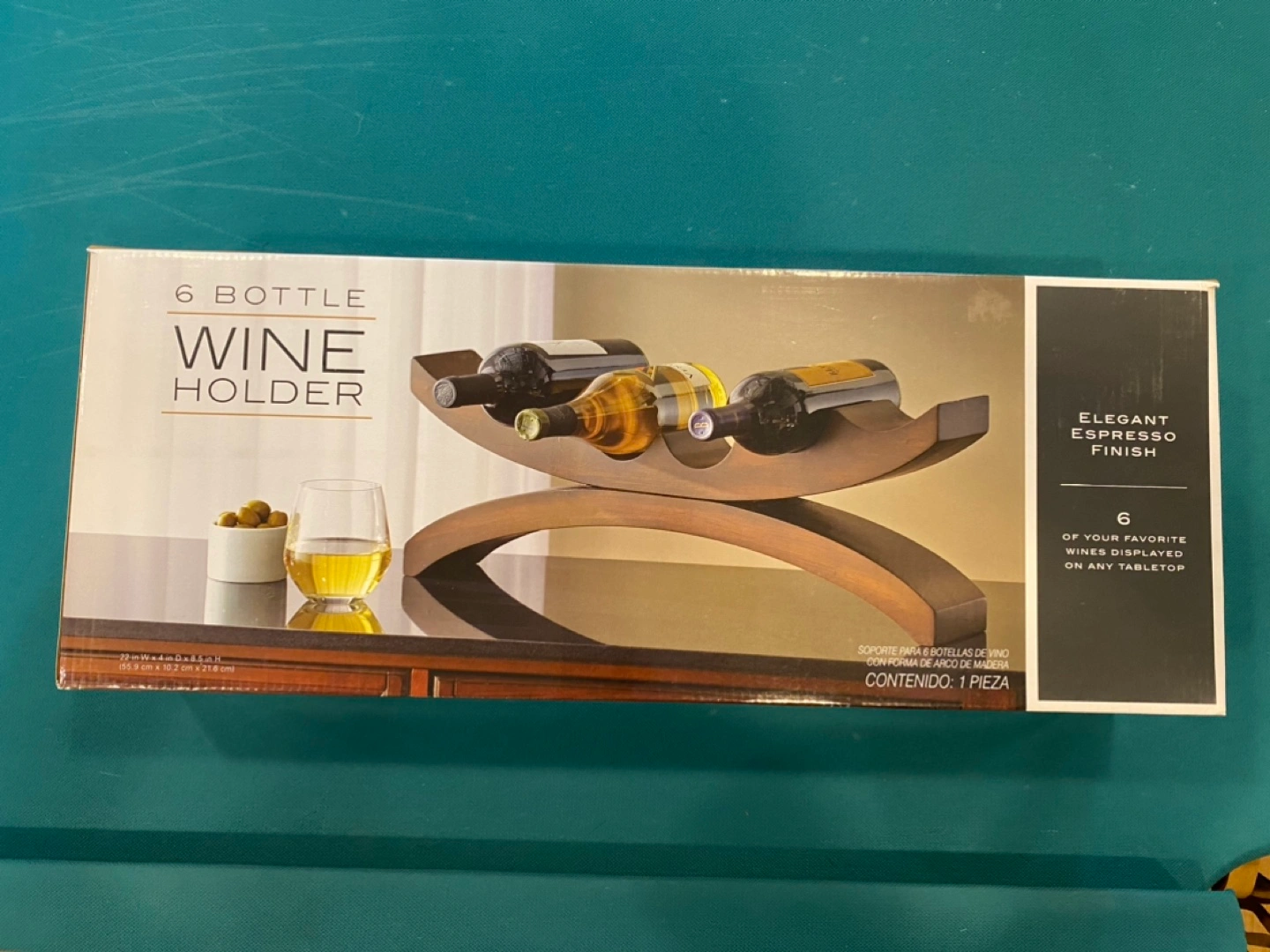 Selling a brand-new 6 bottle wine holder with an elegant espresso finish! It's perfect for displaying your favourite wines on any tabletop.