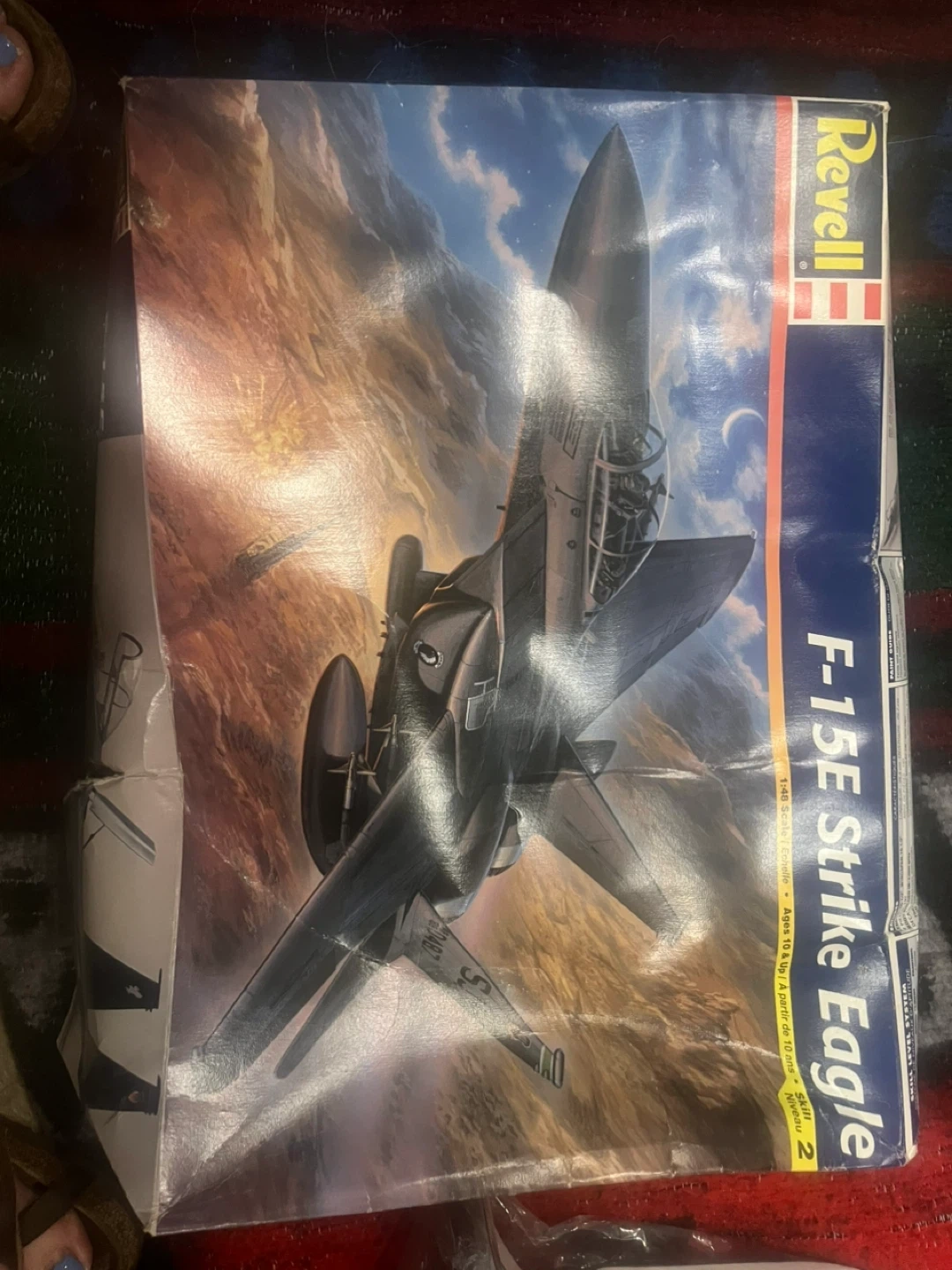 This is a Revell F-15E Strike Eagle model kit. It comes with all the plastic sprues, decals, and instructions for assembly. It's a 1:48 scale kit. A great project for aviation enthusiasts!